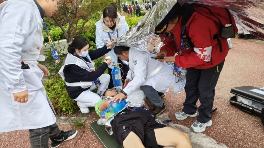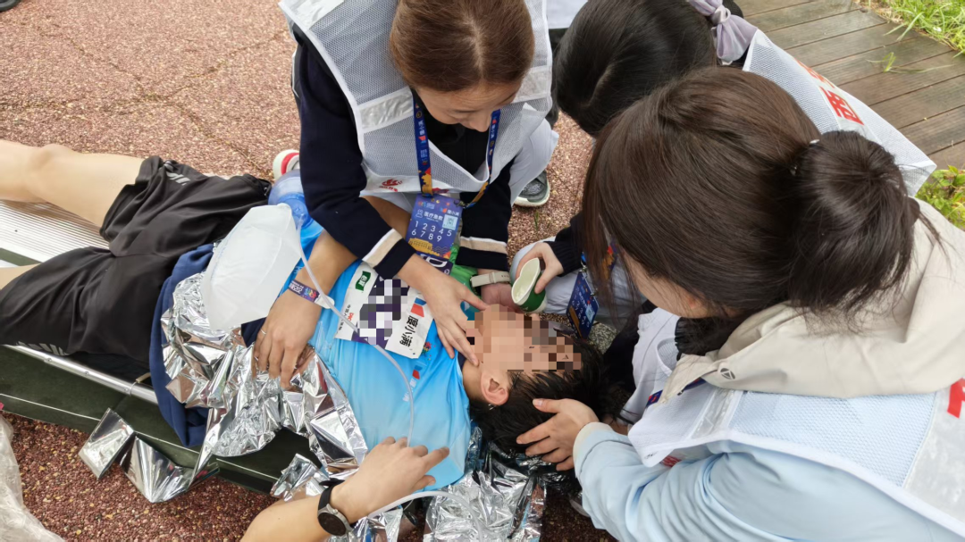 9点15分左右,距离医疗站不远处,一名选手突然晕倒在地,还伴有恶心、双下肢小腿抽搐的症状,好在意识尚清醒。正在医疗站值守的医生周锐、张小强,护士李辉、张乐、朱青听到指令后,即刻响应,迅速抵达现场。经初步评估患者状况,立即采用担架将其安全转运至路边避开赛道;随后,医护人员为他裹上保温毯防止体温下降,给予口服补液盐补充流失的电解质及水分,通过吸氧装置改善机体缺氧状态,并对双下肢进行按摩处理以促进血液循环、缓解肌肉紧张。整个救援过程规范高效,确保患者得到及时有效的初步医疗支持后,将他转送至救护车上接受进一步治疗。