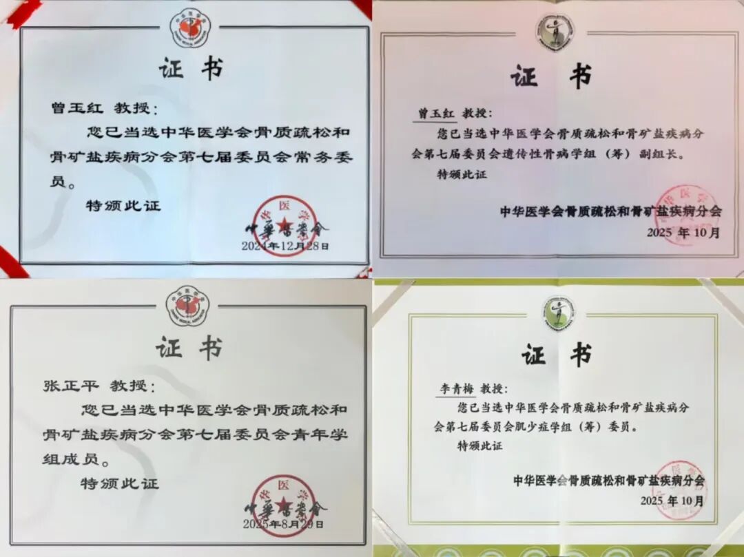 此次换届,西安市红会医院骨质疏松科主任曾玉红任中华医学会骨质疏松和骨矿盐疾病分会第七届委员会常务委员,同时兼遗传性骨病学组副组长,张正平任中华医学会骨质疏松和骨矿盐疾病分会第七届委员会青年学组成员,冯燕任代谢性骨病学组委员,李青梅任肌少症学组委员,师杰任诊断与质控学组委员,新的任职标志着更多责任,为学会的发展增砖添瓦。