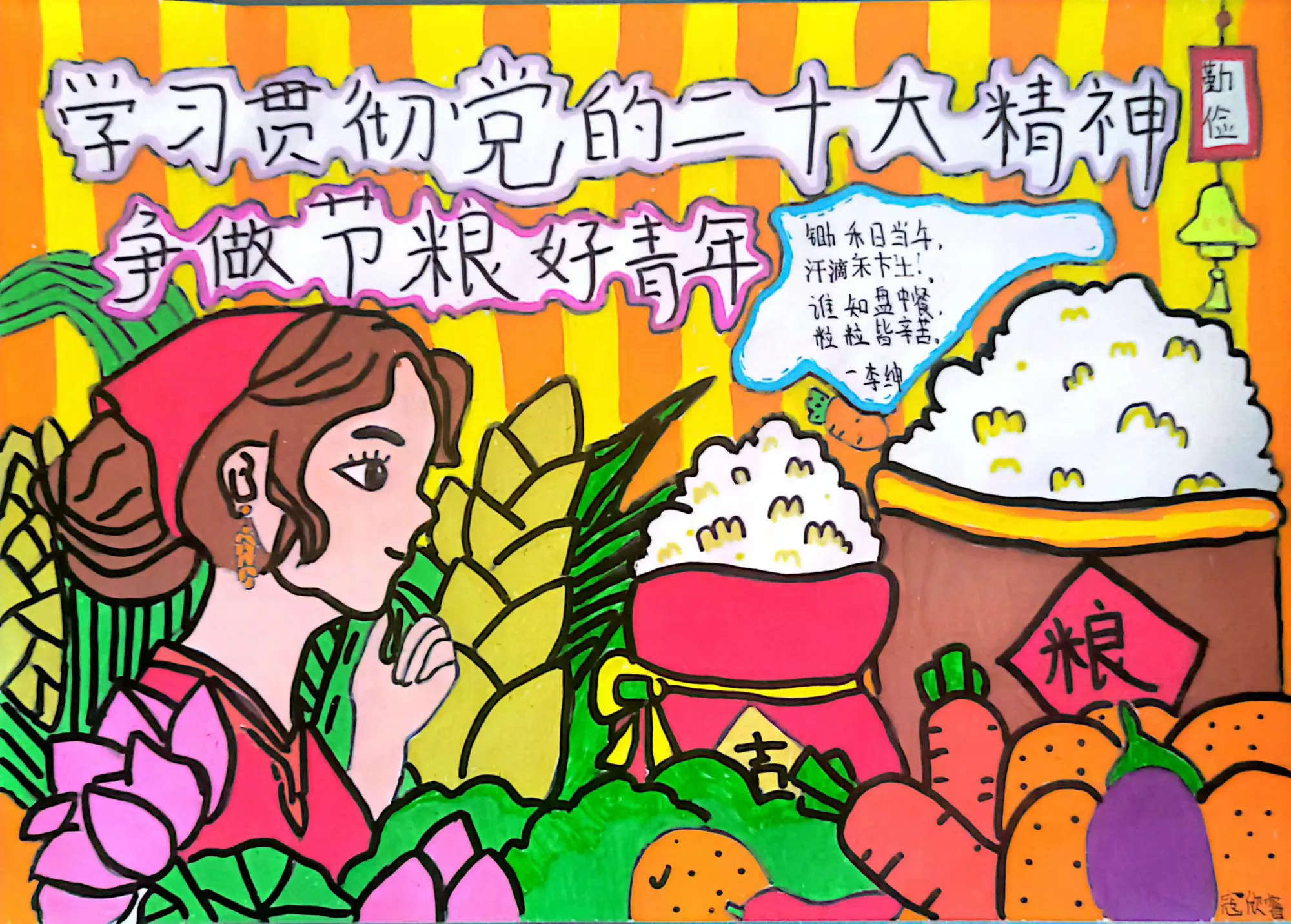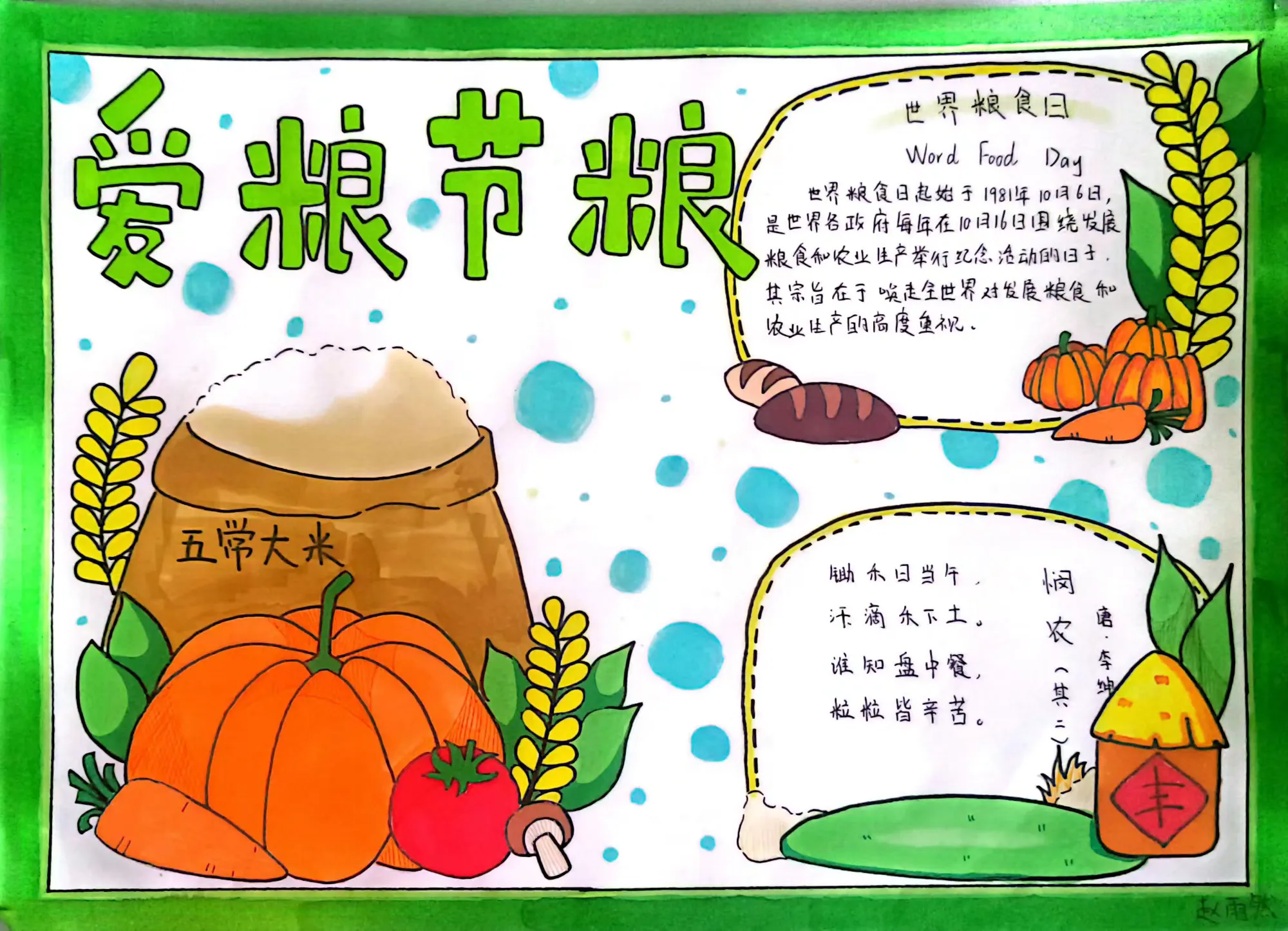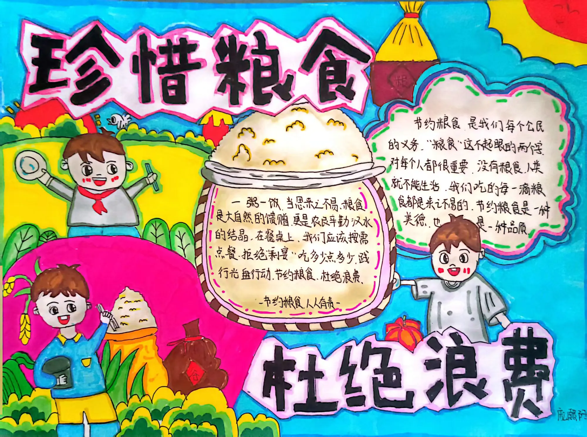 在“节约粮食”主题手抄报活动中,同学们纷纷拿起画笔,用五彩的颜料和稚嫩的笔触,描绘出对粮食的珍视。一张张图文并茂、色彩鲜艳的手抄报,有的描绘了农民伯伯辛勤劳作的场景,有的介绍了世界粮食现状,有的则用可爱的卡通形象倡导“光盘行动”。这些作品不仅展现了同学们出色的绘画和排版能力,更表达了他们对粮食安全的关切和厉行节约的坚定决心。