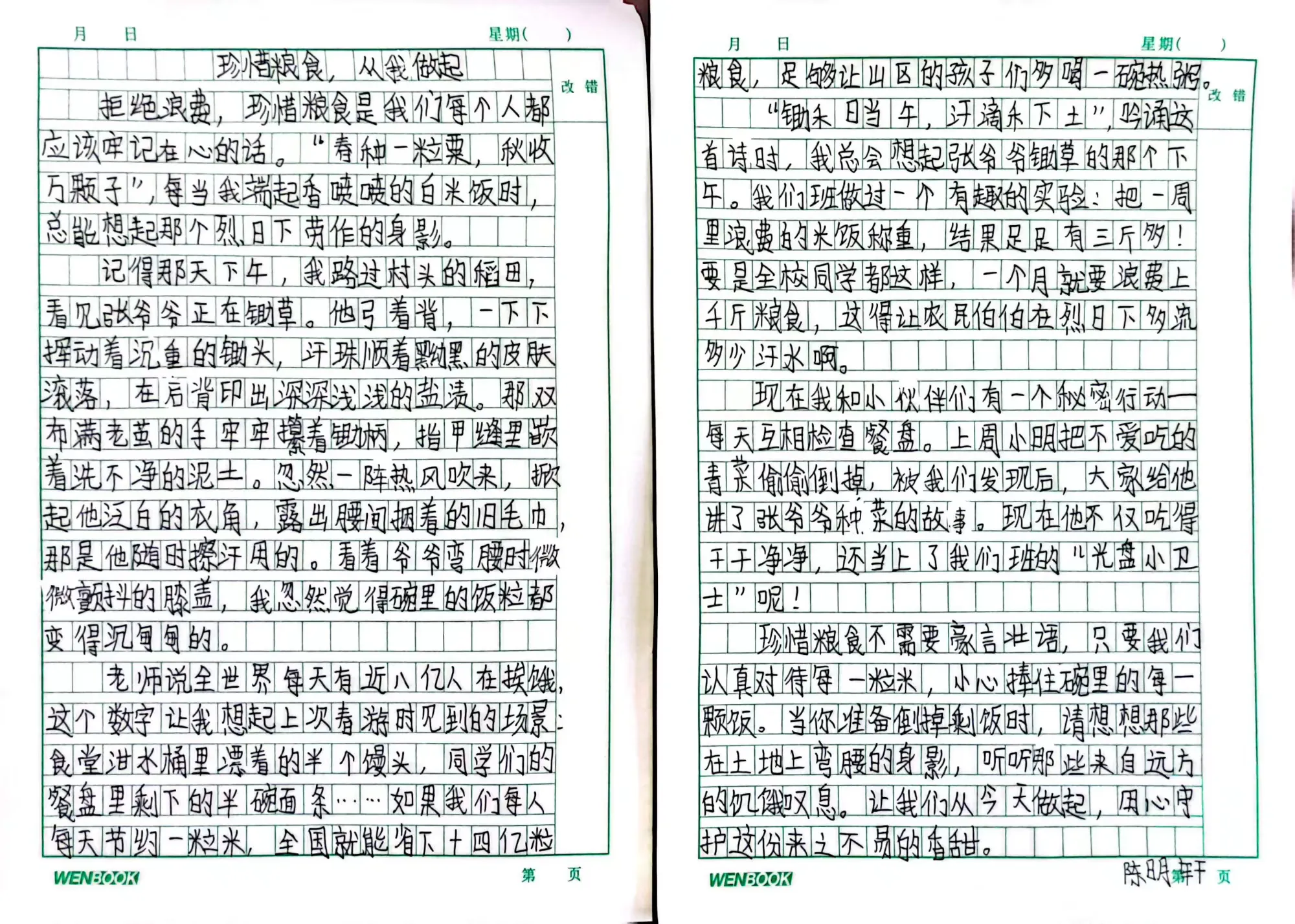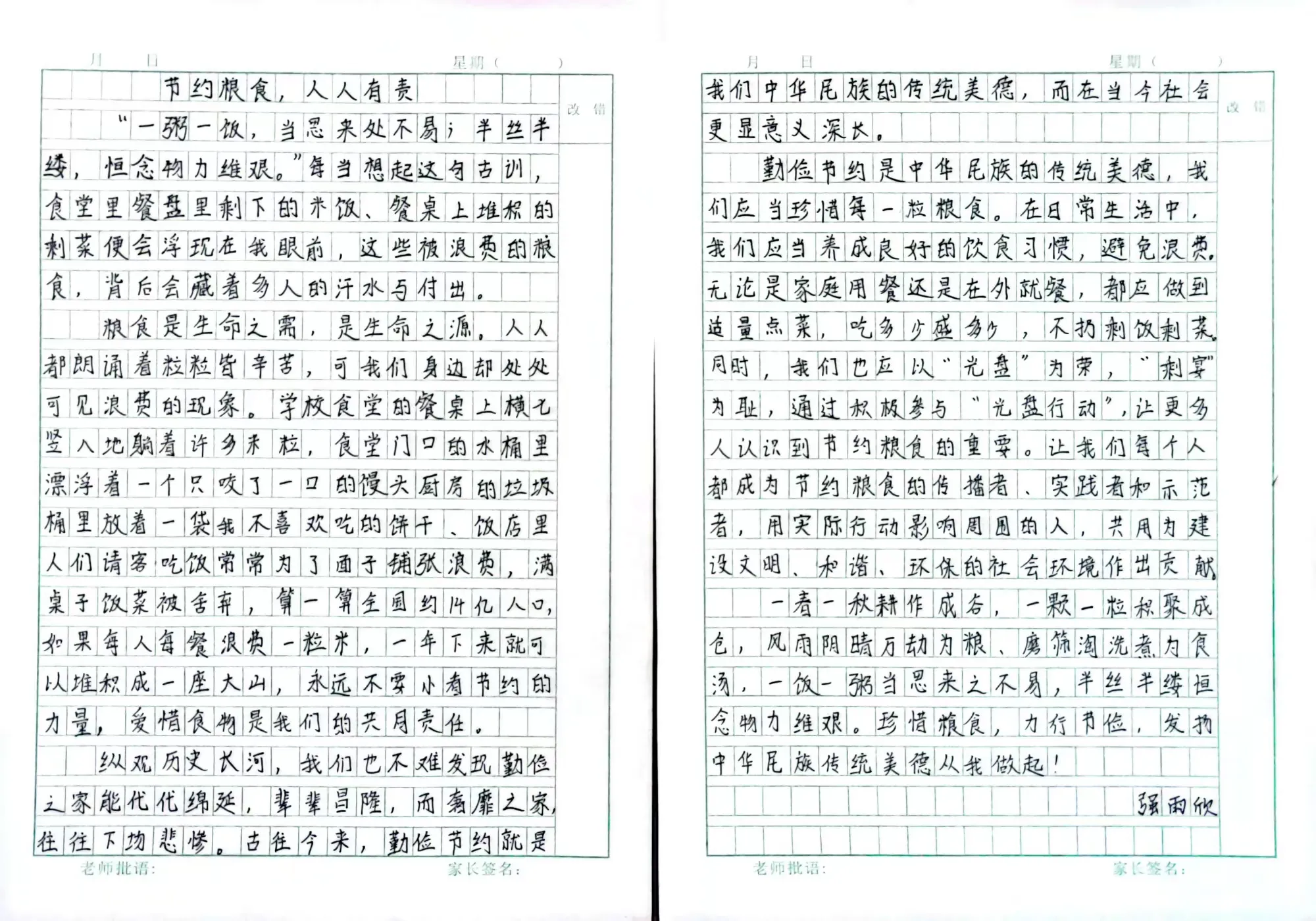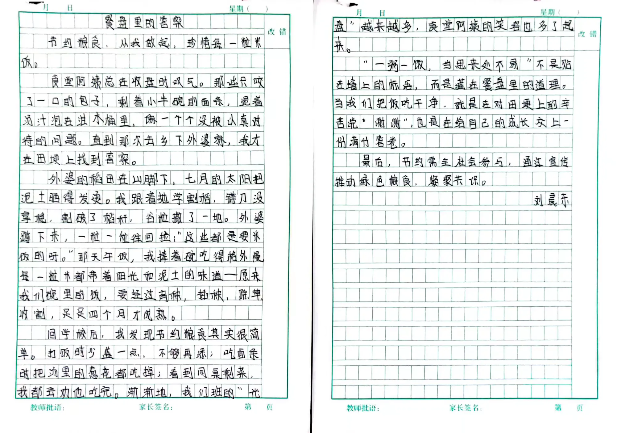 此外,高年级同学还积极参与了“节约粮食”主题征文活动。他们用文字记录下自己对粮食安全的感悟,或讲述自己与家人节约粮食的小故事,或畅想未来如何为保障粮食安全贡献力量。一行行真挚的文字,表达了孩子们从“要我节约”到“我要节约”的思想转变,体现了新时代少年儿童的责任与担当。