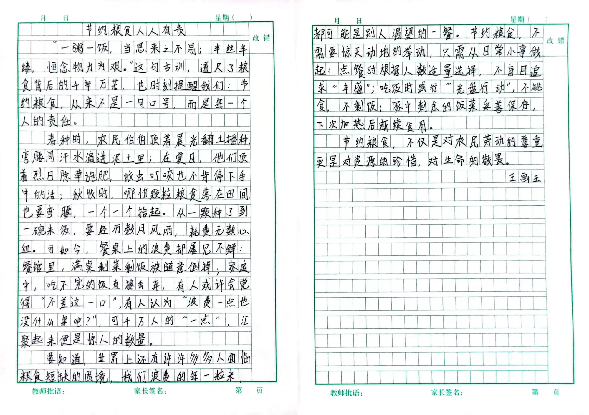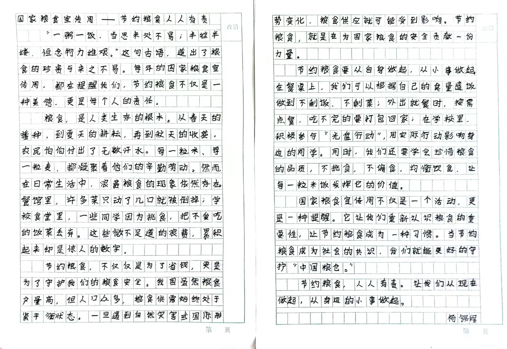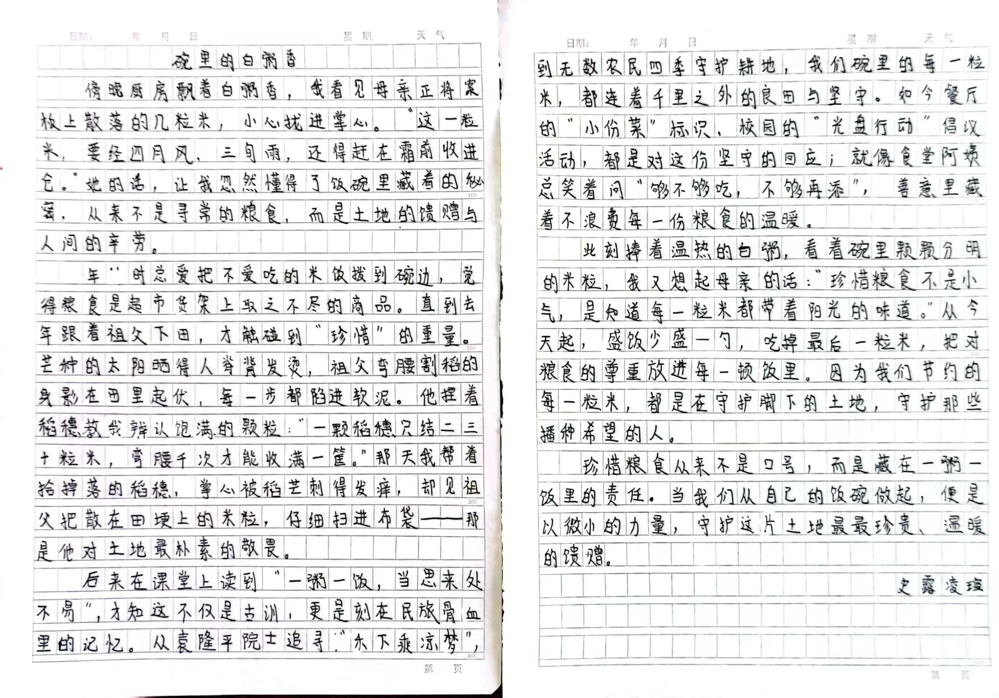 此外,高年级同学还积极参与了“节约粮食”主题征文活动。他们用文字记录下自己对粮食安全的感悟,或讲述自己与家人节约粮食的小故事,或畅想未来如何为保障粮食安全贡献力量。一行行真挚的文字,表达了孩子们从“要我节约”到“我要节约”的思想转变,体现了新时代少年儿童的责任与担当。