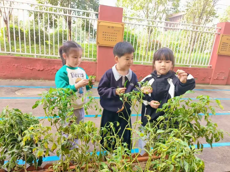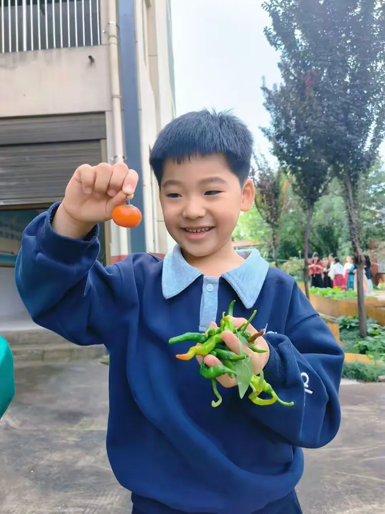 孩子们蹲在萝卜植箱旁,双手抓住萝卜缨子用力一拔,带着泥土清香的萝卜应声而出;他们弯腰摘下红红绿绿的辣椒,手里捧着花生的果实……脸上绽开灿烂的笑容。