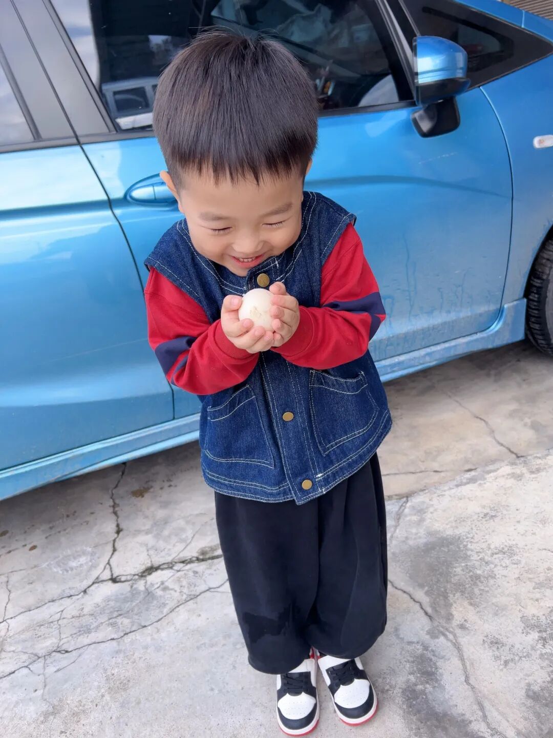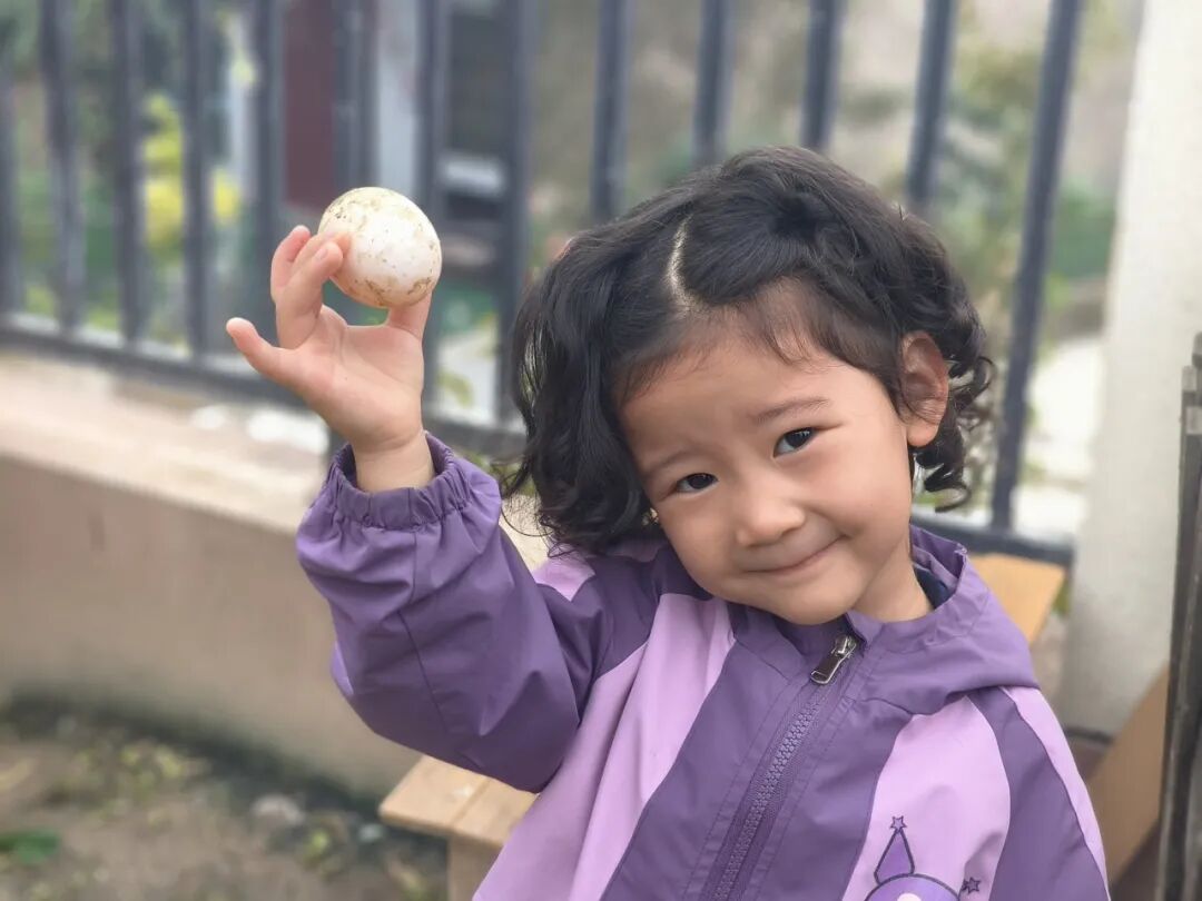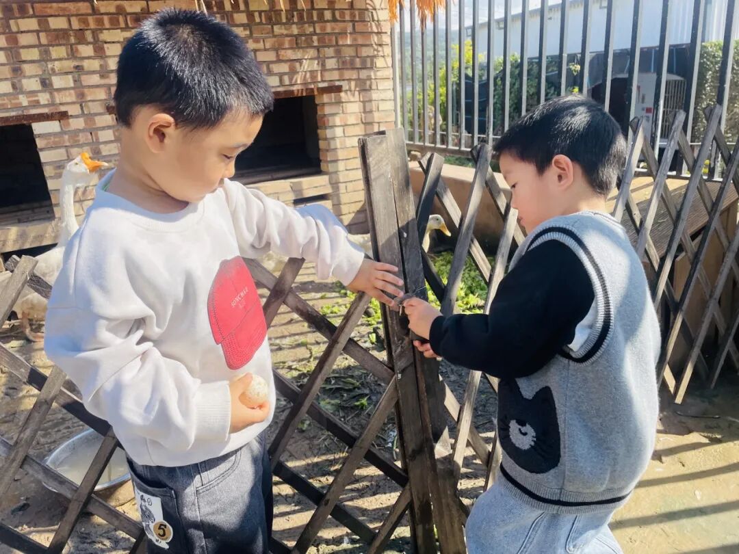 有一天早上,孩子们去看鸭子的时候,发现鸭窝里躺着两枚鸭蛋,孩子们小心翼翼的捧在手心里。