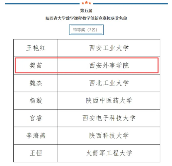 近日,由陕西省教科文卫体工会委员会与陕西省数学会联合主办的第五届陕西省大学数学课程教学创新竞赛获奖结果正式公示。西安外事学院共有8位教师参与比赛,其中商学院樊苗荣获特等奖,商学院田启燕、工学院苗壮荣获三等奖。