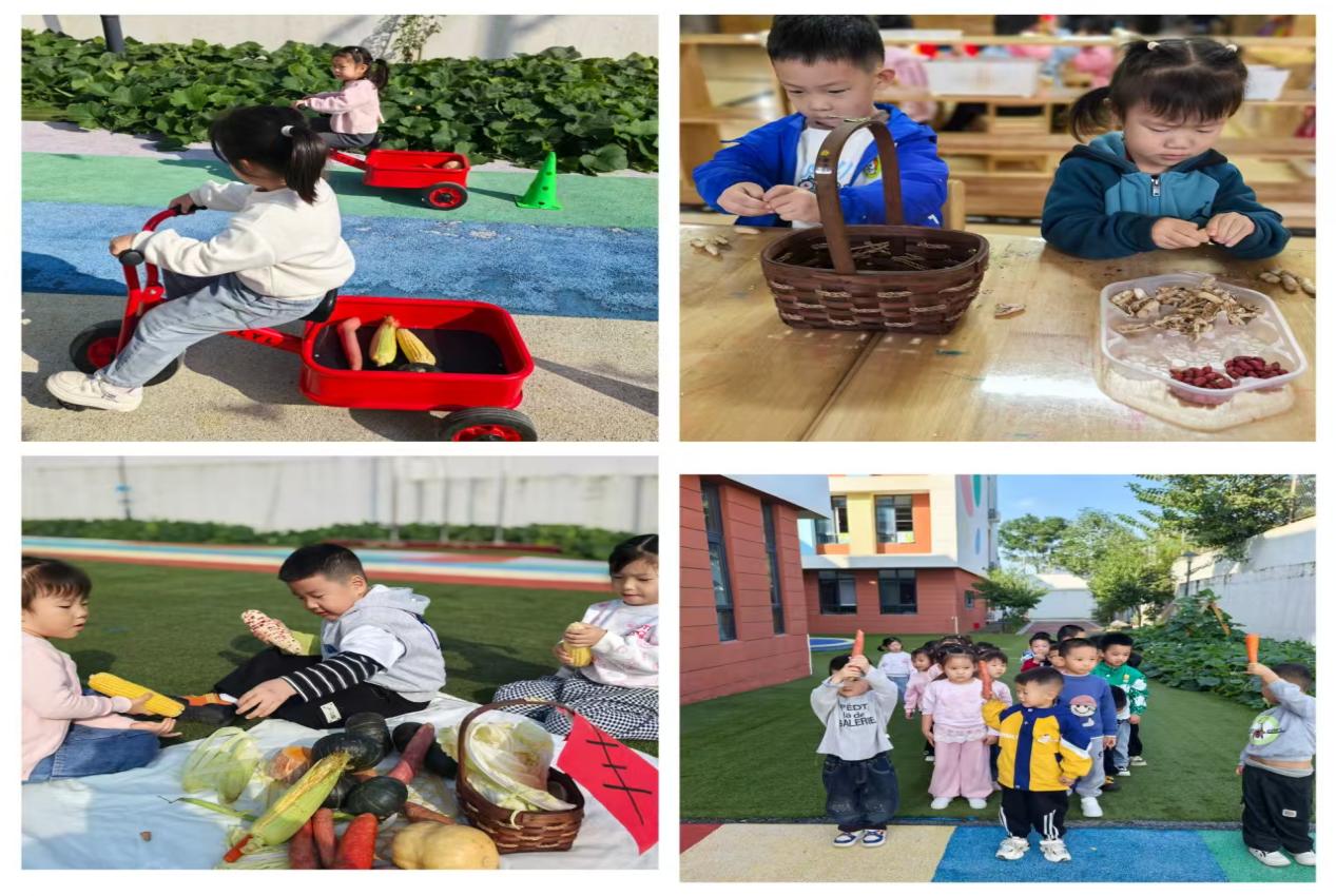 室外活动区化身“丰收竞技场”,五大趣味游戏点燃孩子们的热情。在“运粮小能手”游戏中,孩子们推着装满玉米、红薯的小推车,化身“小小运输员”守护“粮食”;“南瓜滚滚”环节里,大家蹲在地上,用手轻轻推动南瓜,看着南瓜顺着路线滚动,笑声洒满整个场地;“剥剥乐”中,孩子们围坐成圈,认真地将玉米、花生进行剥离,感受农作物的纹理与质感;“拔萝卜”游戏最是热闹孩子们使劲儿拔,成功时的欢呼声在幼儿园久久回荡;“红薯接力”则考验反应力,孩子们手持红薯精准接住,每一次成功“接力”都伴随着雀跃的尖叫。