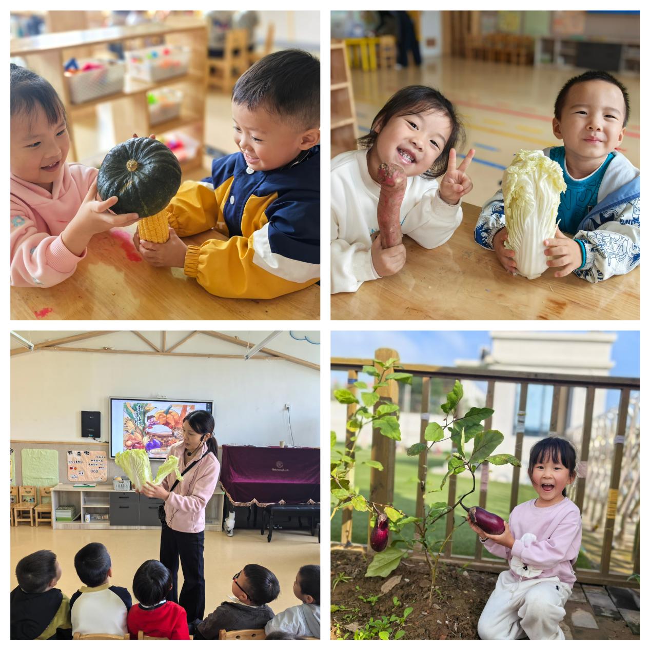 室内活动则聚焦“细致探索”,在观察与实践中深化对丰收的认知。集体观察时,老师将胡萝卜、白菜、土豆等新鲜蔬菜摆放在桌上,带领孩子们认识蔬菜的外形、颜色,讲解它们从土地到餐桌的生长过程;分组观察环节,孩子们三五一组围坐,近距离触摸蔬菜表面的纹路、感受重量,还会指着土豆的芽眼、青菜的叶脉互相分享发现,在交流中加深了对农作物的了解。