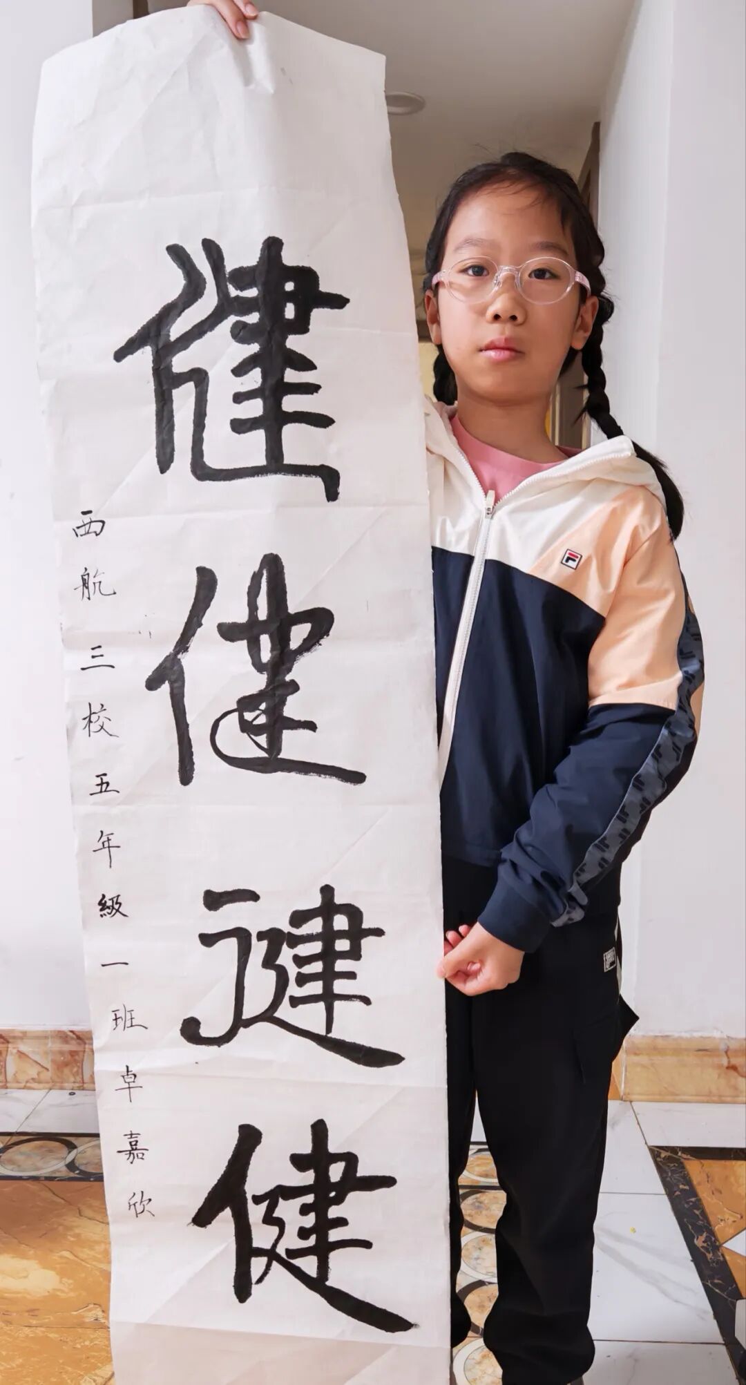 当卓嘉欣同学的作品悬挂在西校区校门口时,它就像一面迎风招展的旗帜,也象征着五一班的“健”心实践活动画上了一个圆满的句号。(王榕)