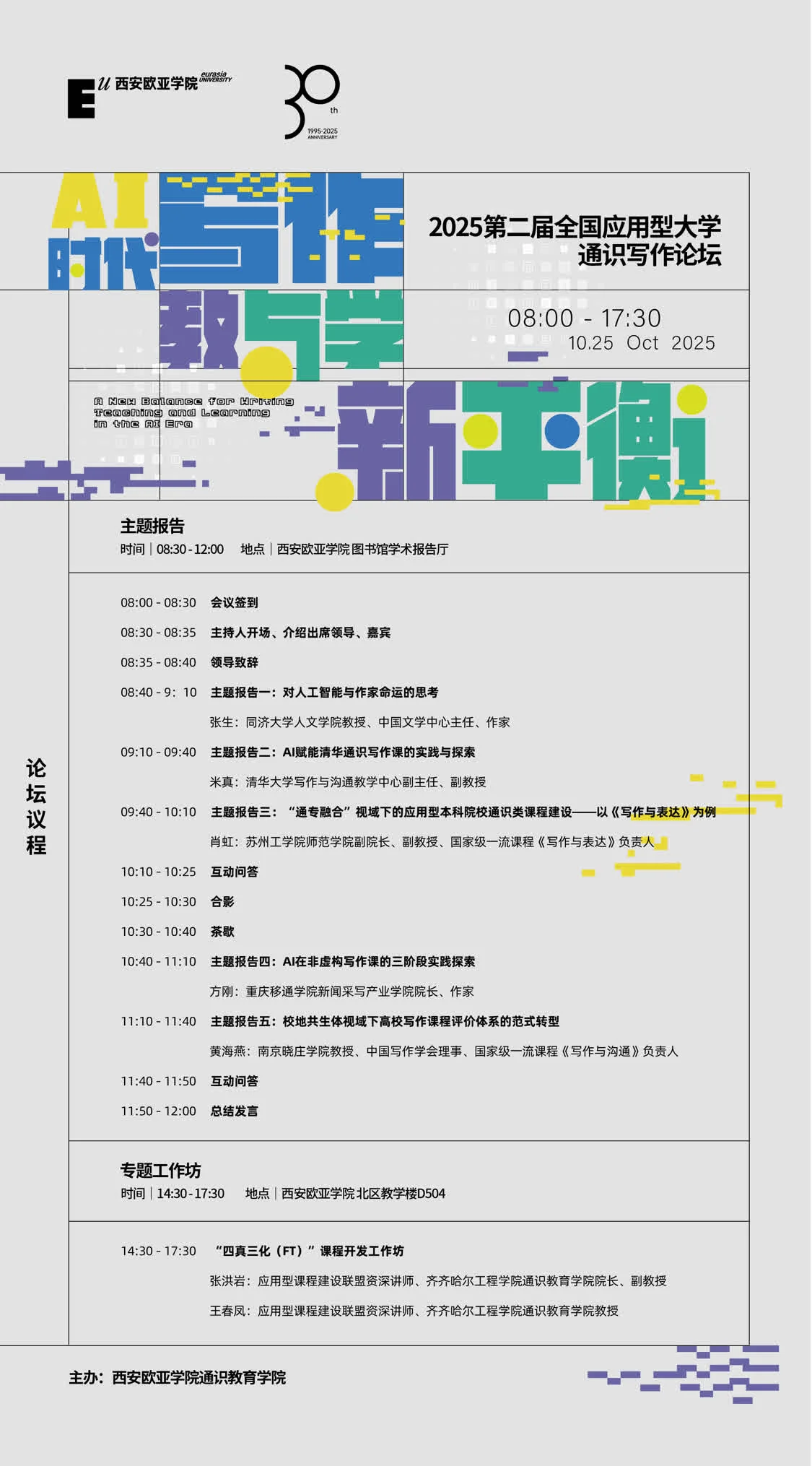 在这一背景下,如何利用AI赋能教学,避免AI引发的种种问题,已成为高校写作教育的关键议题。为推动应用型大学通识写作教育创新,搭建交流协作的平台,西安欧亚学院通识教育学院将于2025年10月25日举办“AI时代下写作教与学的新平衡”第二届全国应用型大学通识写作论坛,我们诚挚邀请全国各院校领导、同仁,专家、教师拨冗参会,共同探讨如何为写作教学注入AI时代的智慧与温度,共寻教与学的新平衡。
