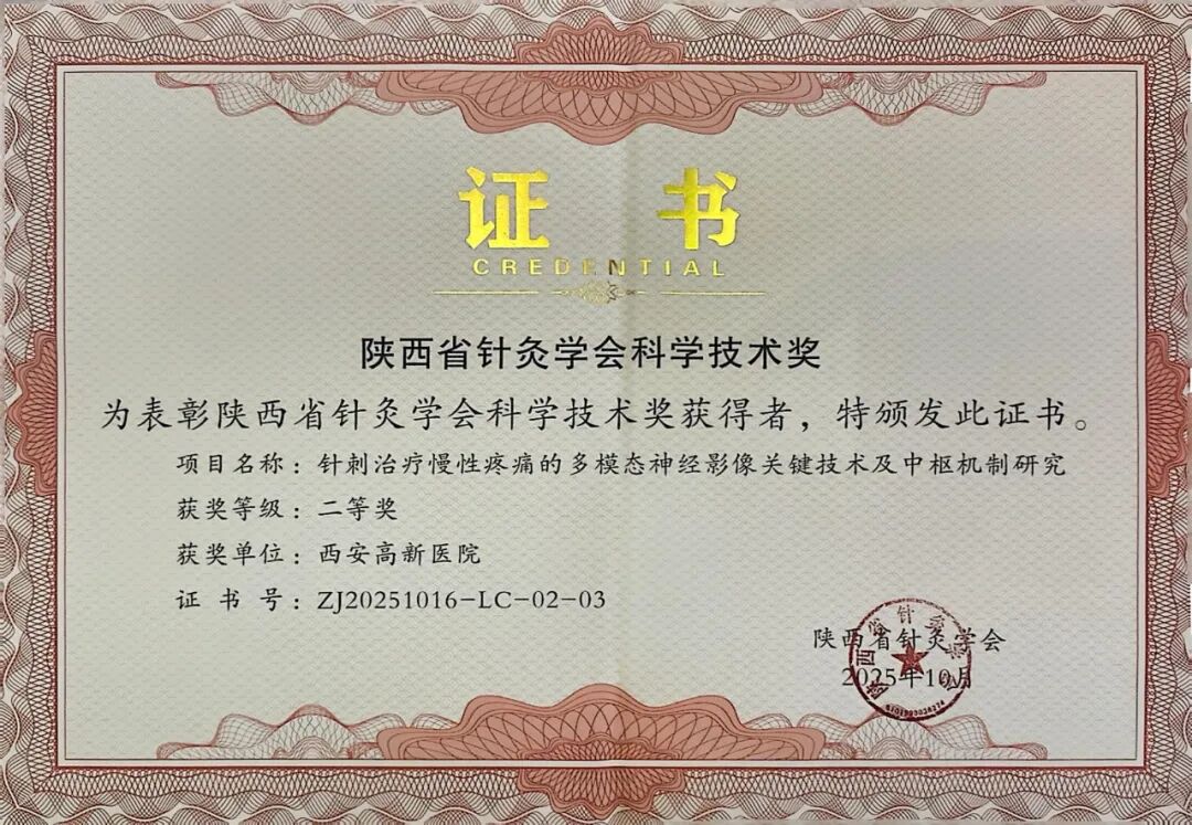 阳光讯(记者 郑亚雷)近日,由西安高新医院超声科赵腾医生参与完成的科研项目《针刺治疗慢性疼痛的多模态神经影像关键技术及中枢机制研究》,荣获陕西省针灸学会科学技术奖二等奖。