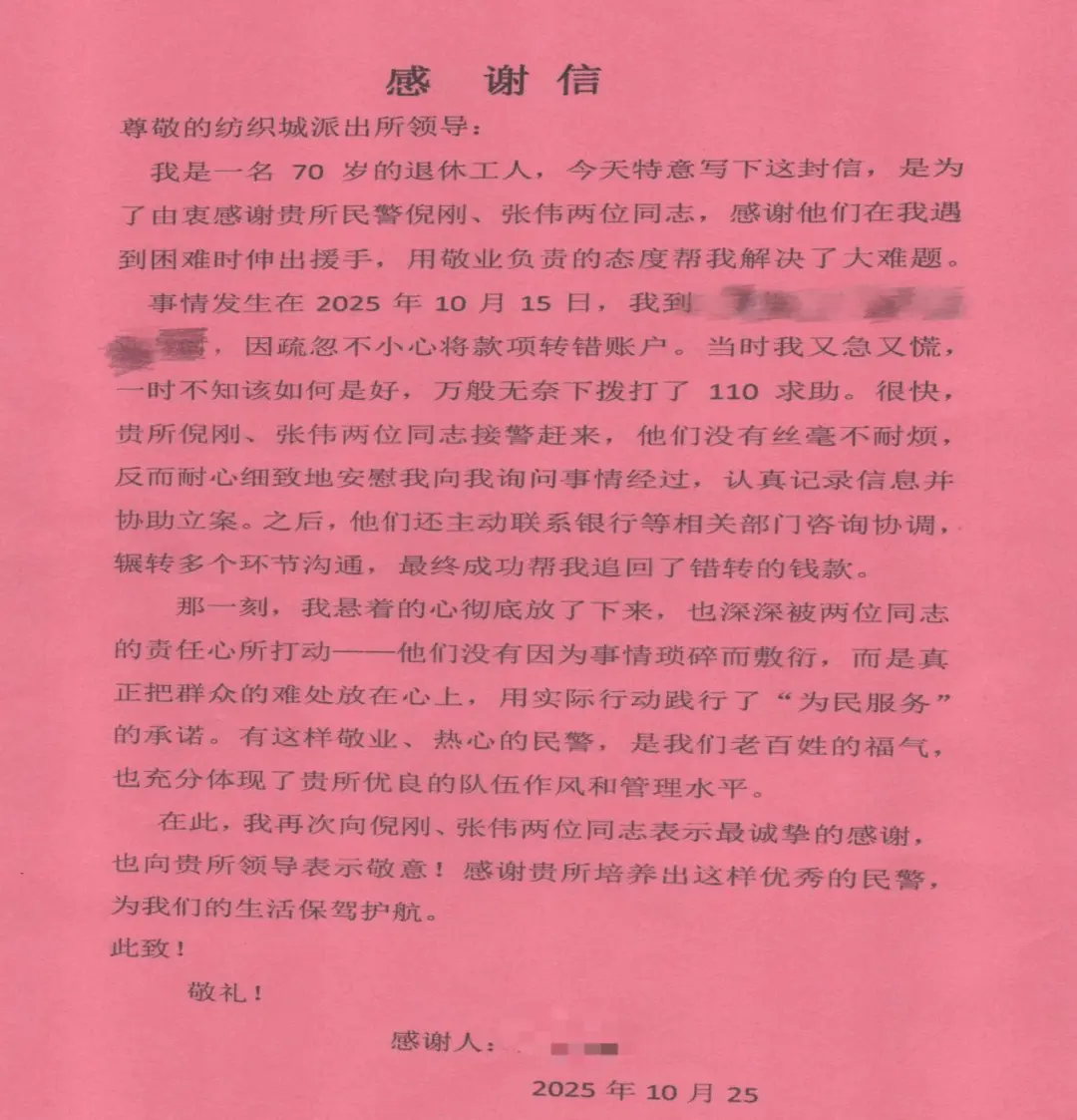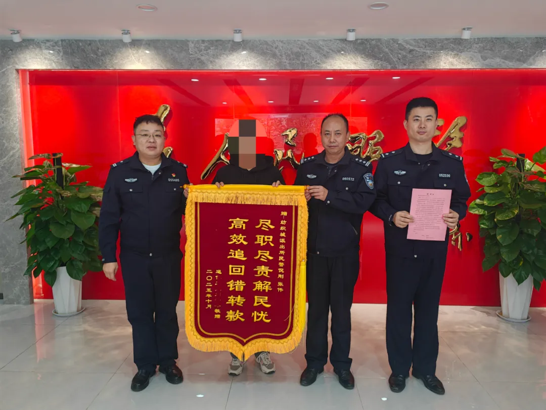 事情源于10月15日,老人因操作不慎,误将2万元款项转入了他人账户。发现后,老人焦急万分,当即报警求助。接警后,倪刚、张伟迅速赶到现场。他们一面耐心安抚老人情绪,一面细致了解情况,并立即着手联系银行、核查信息、多方协调,严格依照程序推进退款流程。经过不懈努力,这笔“转错”的钱款最终被成功追回。