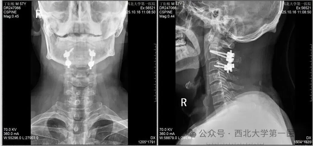 在医护人员的精心照料下,患者未出现任何神经并发症,颈部疼痛显著缓解,目前正在顺利康复中。术后颈椎DR显示,内固定物位置良好。