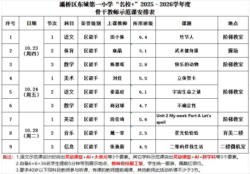 骨干示范课作为西安市灞桥区东城一小深耕多年的“教学名片”,今年迎来AI时代新突破!本年度活动以“1+1+n”模式为核心亮点,用“灵动课堂” 打底、“AI技术”提效、“学科特色”加分,让传统示范课焕发新活力。更有7学科、9位骨干教师组成“硬核阵容”,他们将用扎实的教学功底和前沿理念,为大家献上一场场兼具“专业性”与“创新性”的课堂盛宴。