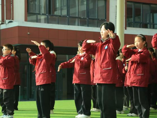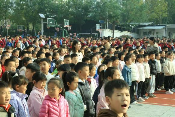 随着雄壮的《义勇军进行曲》奏响,五星红旗冉冉升起,全体师生肃立行注目礼,爱国情怀与庄重氛围在校园中激荡。在陈伊铭老师的指挥下,全体师生高声齐唱国歌,嘹亮的歌声回荡在校园里。