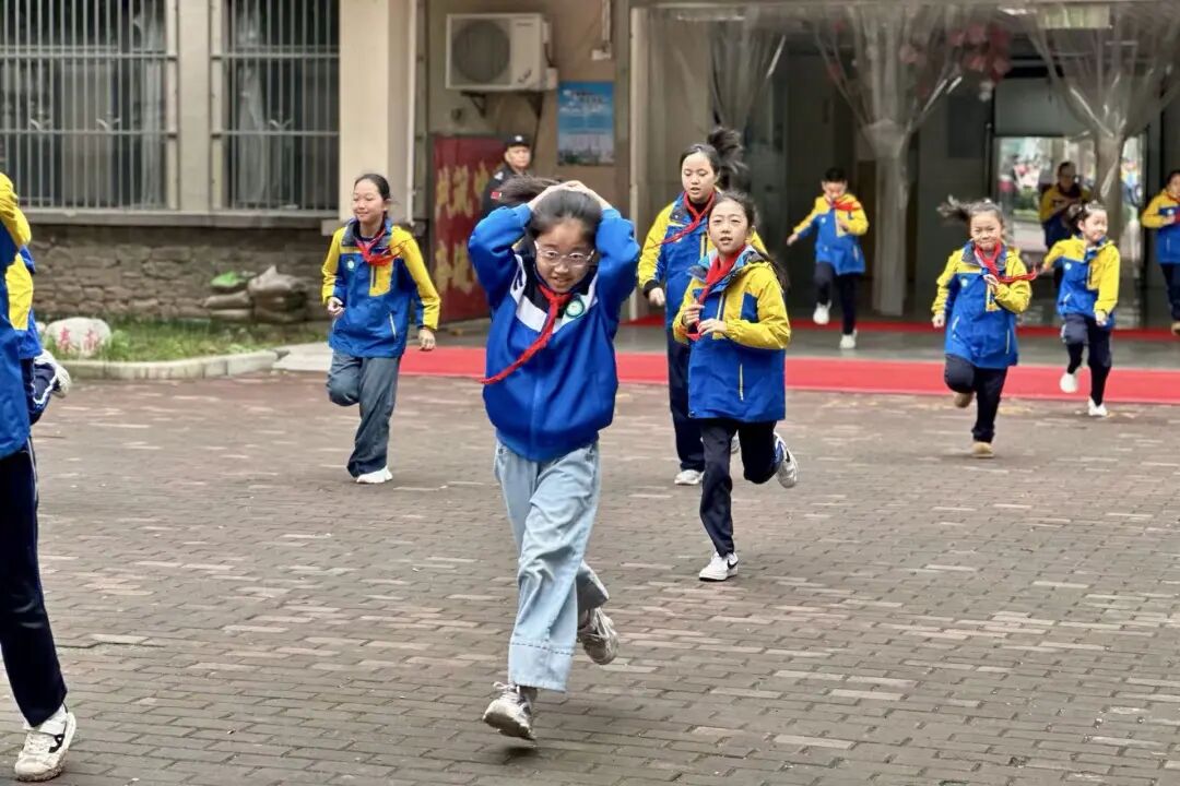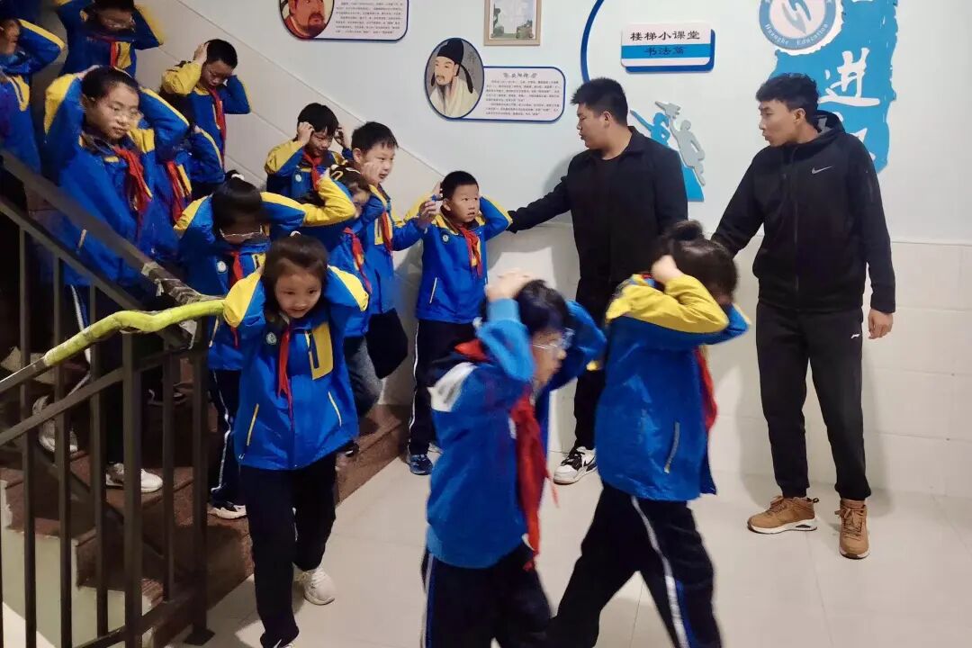 随着警报声在校园内响起,所有师生进入状态。在老师的指引下,学生们保持弯腰姿势、手扶墙壁,按顺序快速有序撤离,在楼梯拐角等关键位置,负责值守的老师持续抬手示意,全力保障疏散过程安全顺畅。