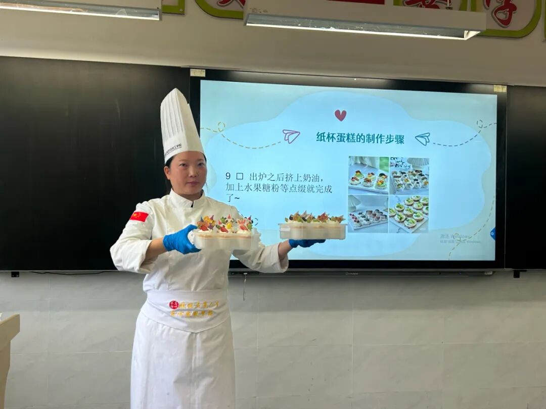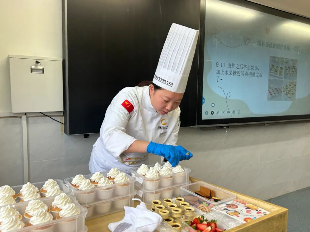 最令人期待的,当属纸杯蛋糕的制作与装饰环节。她先为同学们细致展示了蛋糕胚的制作要点,从面粉、鸡蛋的精准配比,到烤箱温度与时间的严格控制,每一个细节都讲解得通俗易懂。接着,她重点演示了奶油挤花和配料装饰的技巧 —— 手握裱花袋要力度均匀,从中心向外缓缓转圈,就能挤出饱满圆润的奶油花;再轻轻点缀上彩色糖珠、新鲜果粒,原本朴素的纸杯蛋糕,瞬间变得精致又可爱。同学们紧紧围在操作台旁,眼睛里满是好奇与期待,不时为老师娴熟的手法发出阵阵赞叹。
