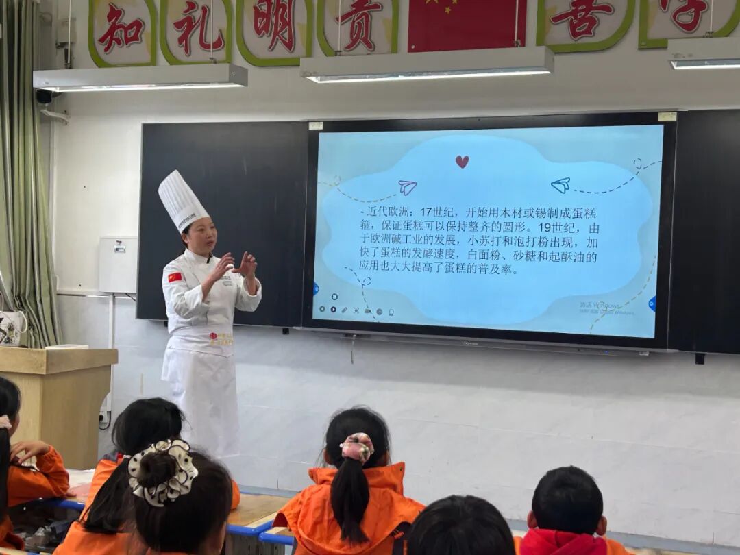“蛋白要打发到什么程度呀?”“奶油花怎么挤才好看呢?”2025 年 10 月 24 日下午,西安市灞桥区庆华小学洪庆分校 “家长进课堂” 活动如期开启。四年级三班吴若依妈妈,凭借生动有趣的讲解和耐心细致的手把手教学,带着同学们一同走进了充满香气的甜蜜烘焙世界。