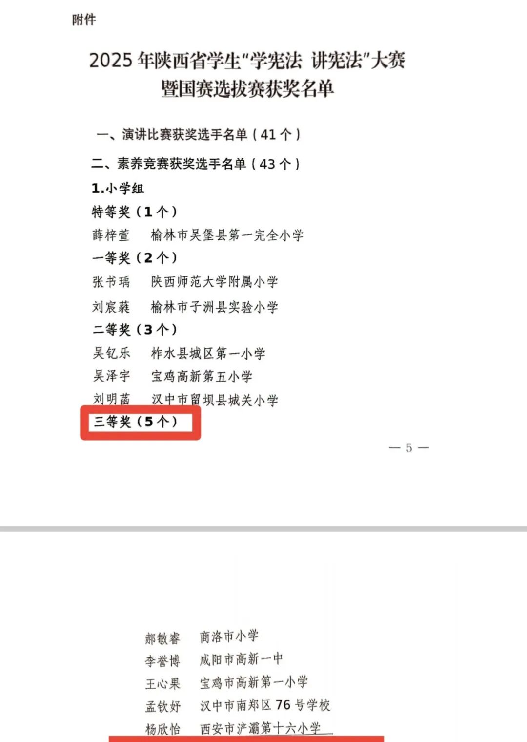 两位同学取得的优异成绩,是西安市浐灞第十六小学坚持“五育并举”、全面育人成果的生动体现。希望同学们再接再厉,在更广阔的舞台上弘扬宪法精神、传承传承红色基因、传递文化自信,展现西安市浐灞第十六小学学子的卓越风采!