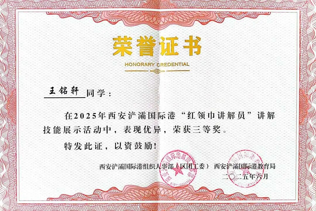 在2025年西安浐灞国际港“红领巾讲解员”讲解技能展示活动中,西安市浐灞第十六小学六年级六班王铭轩同学,用生动的语言和真挚的情感,围绕博物馆讲述中国故事,传递文化自信,表现优异,荣获三等奖。