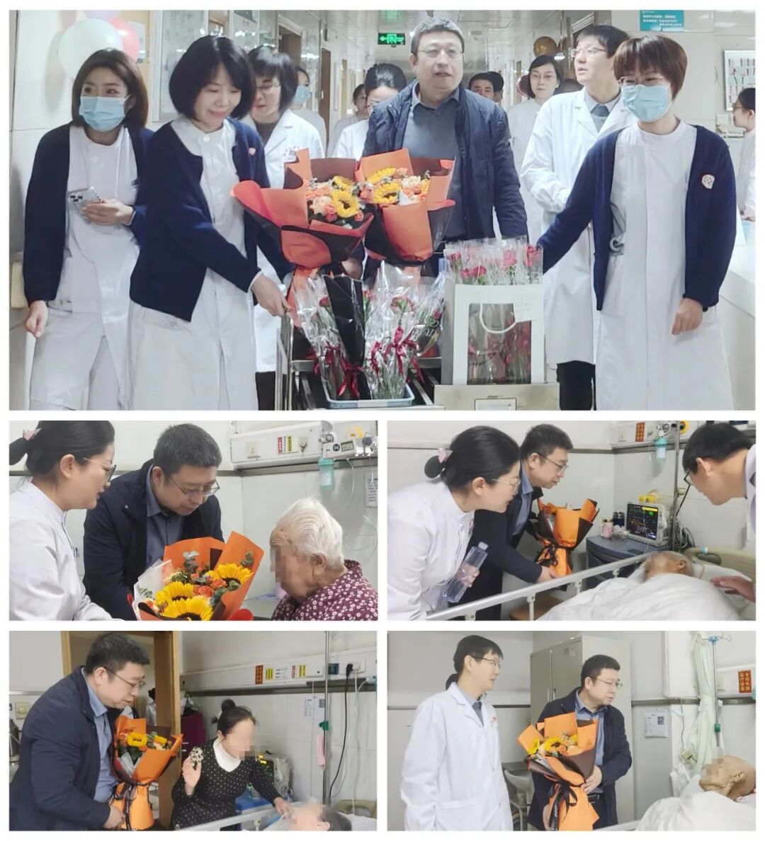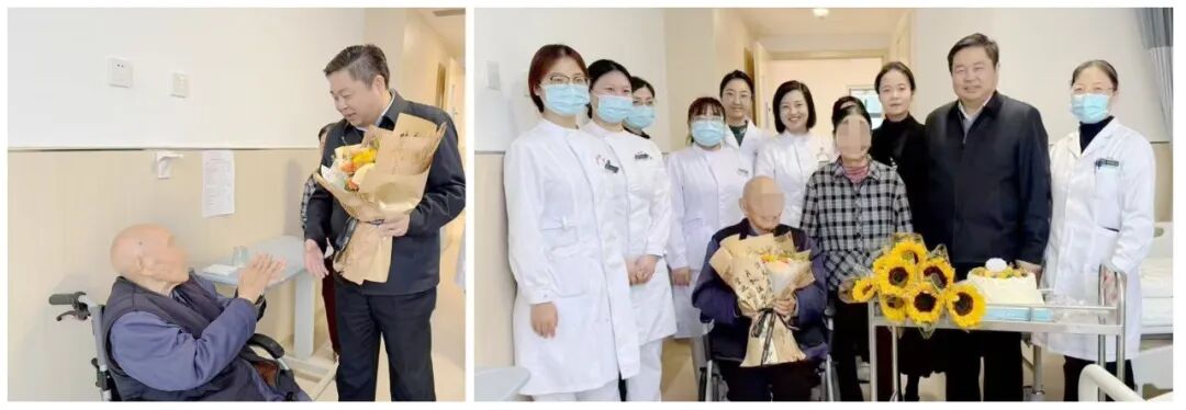 西安市中心医院郭宏珺副院长为北大街院区老年病科的四位百岁老人送上鲜花,将院领导的问候与关怀传达给每位老年患者。