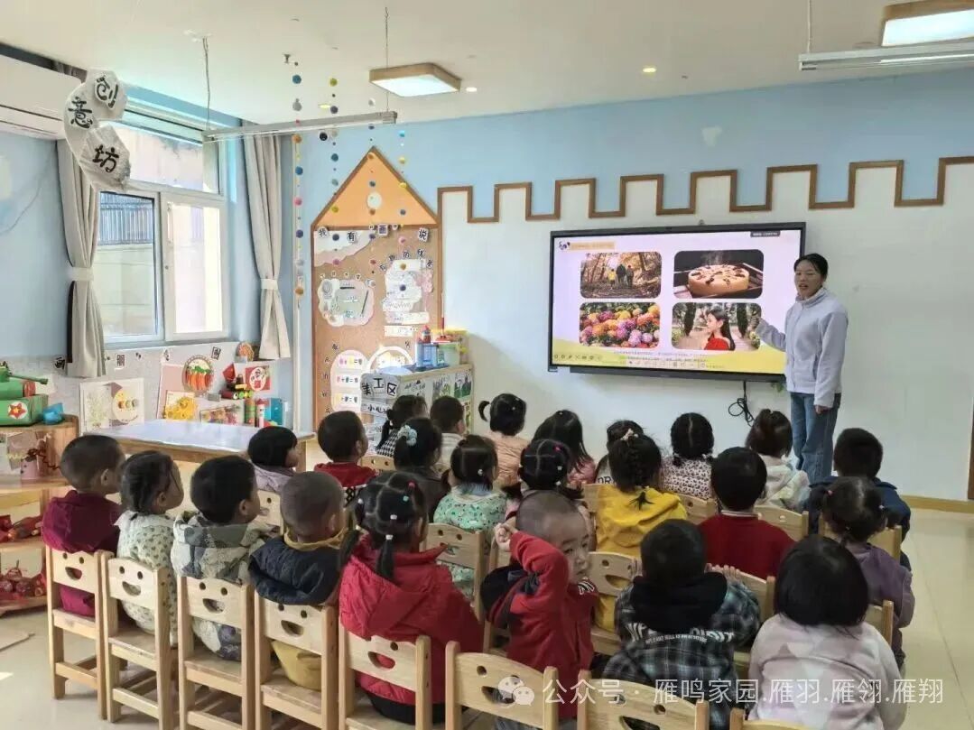 活动室里,老师通过绘本、视频与情境讲述,开展《重阳知多少》主题教学。孩子们在故事中了解登高、赏菊、佩茱萸等传统习俗,更在师幼互动中理解“敬老爱老”的文化深意。