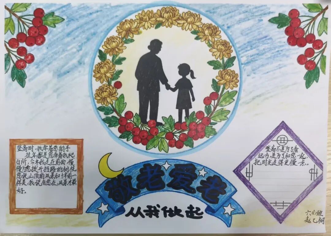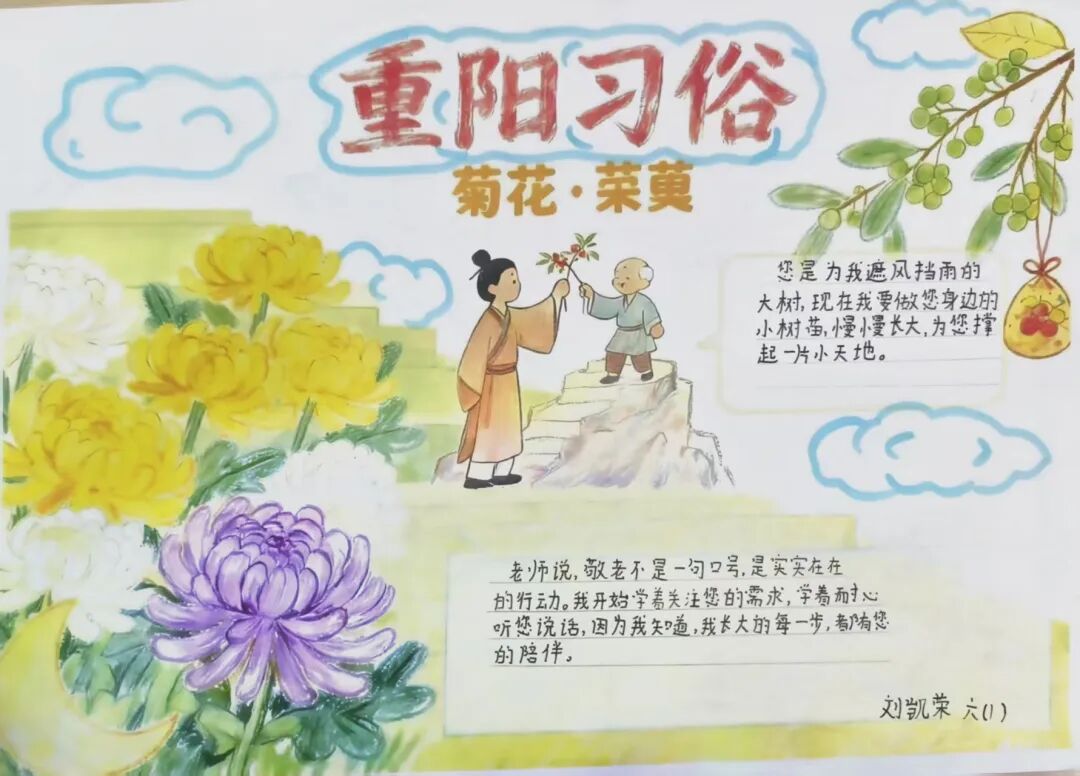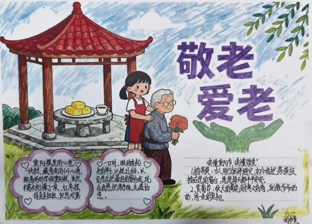 除了温暖的行动,队员们还拿起画笔,将心中的感恩与对重阳节的理解绘制成一幅幅精美的手抄报。版面设计新颖,色彩搭配和谐,字里行间充满了对长辈的敬意与爱戴。这一笔一画,不仅是才艺的展示,更是中华孝道文化的传承与弘扬。