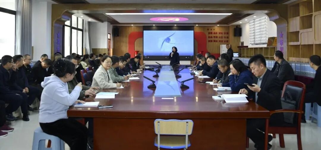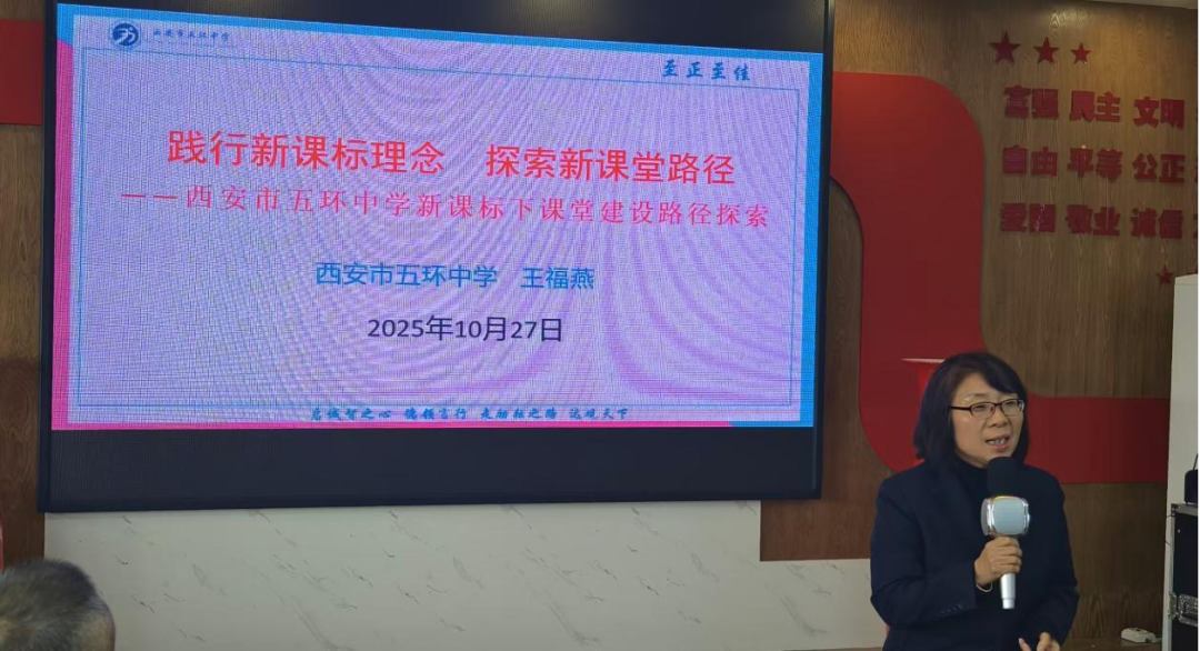 在对学校有了初步的了解后,学校教师发展中心主任王福燕老师给校长嘉宾们做了题为《践行新课程理念 探索新课堂路径》的专题交流报告,重点介绍并展示了近年来西安市五环中学积极探索并卓有成效的“五环节·任务驱动”课堂教学新模式。报告从理论支撑、模式构建、实践案例、初步成效及反思展望等多个角度,系统阐述了西安市五环中学以学生为中心、以核心素养为导向的课堂转型之路。通过生动的教学实例和详实的数据分析,展现了西安市五环中学教师在激发学生主动探究、合作学习、深度思维方面的有效尝试。与会校长们凝神聆听,不时记录,并就新模式下课程设计、师生角色转变、评价体系改革等关键问题与西安市五环中学领导、教师代表进行了深入的探讨。思想的火花在交流中迸发,教育的共识在对话中凝聚。
