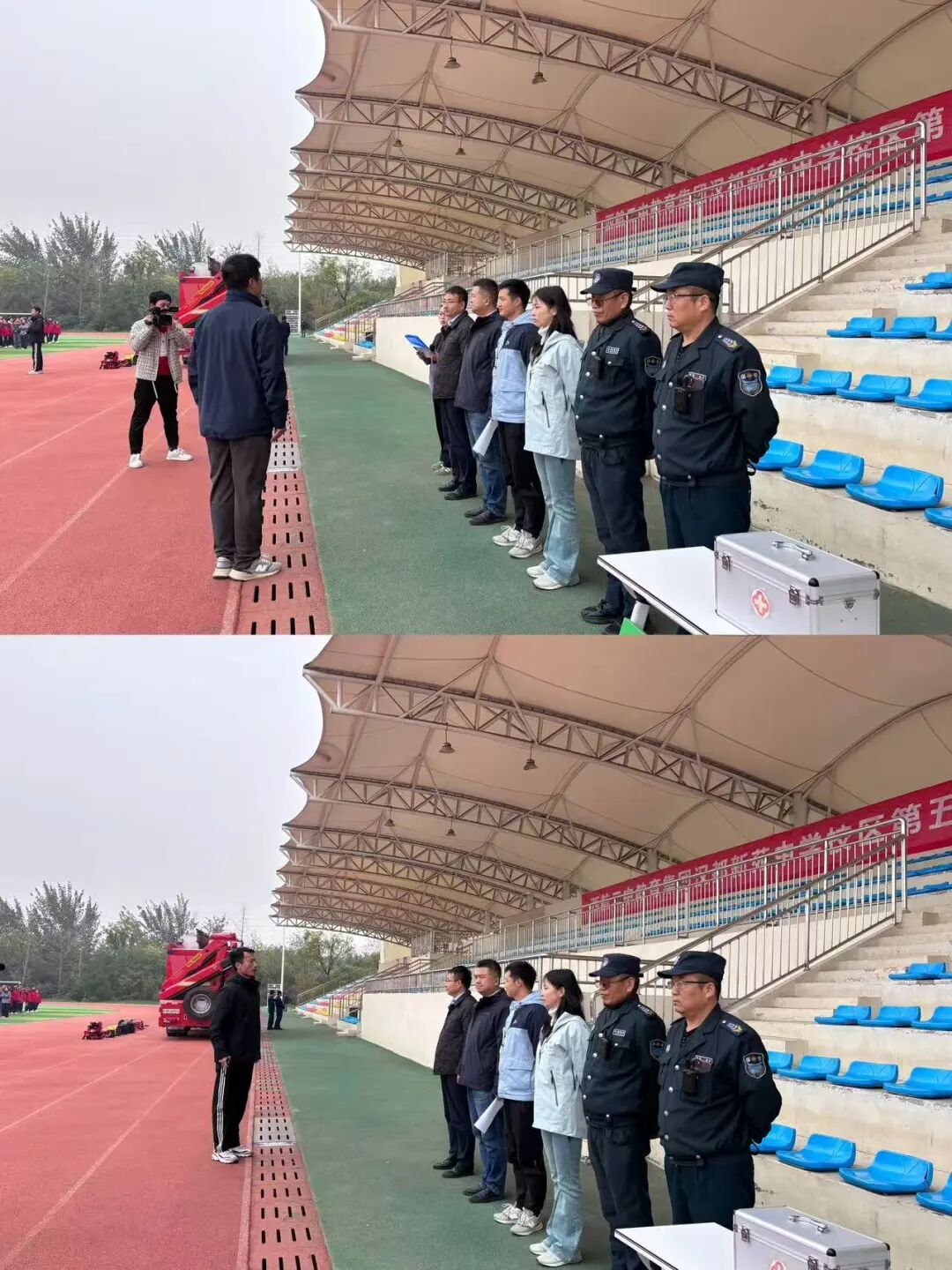 当急促的消防警笛声准时划破校园宁静,校园广播同步播报清晰的疏散指令。接到指令后,师生反应迅速,立即用衣物严密掩住口鼻,以班级为单位排成两列纵队,保持低重心姿势沿预设疏散楼梯有序下楼。抵达操场后,各班主任第一时间清点本班人数并精准上报年级组长,随后李旭艮老师与罗栋老师汇总统计全校师生人数,向演练指挥部汇报,全程确保无一人遗漏。