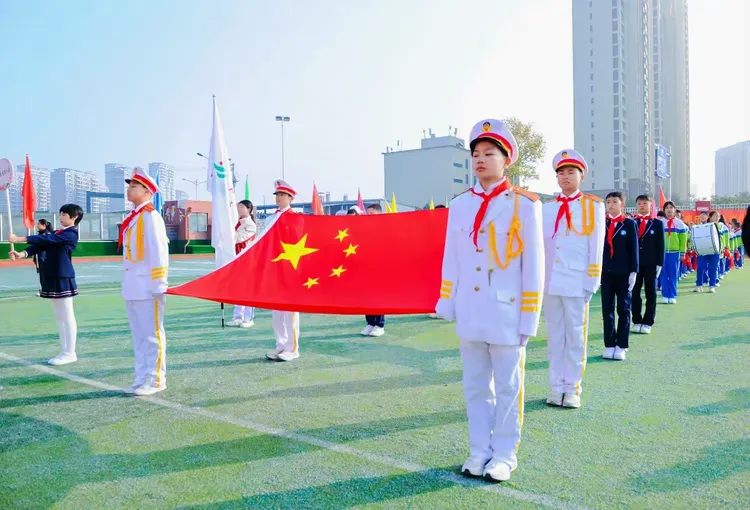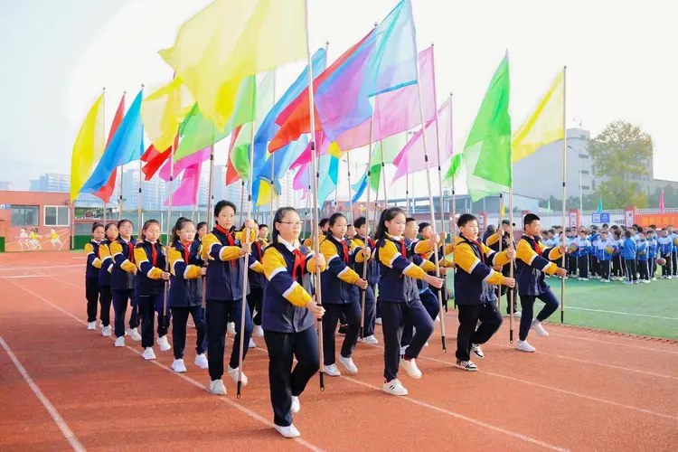 伴着雄壮有力的运动会进行曲,开幕式在国旗引领下启航。国旗方阵擎旗前行、步履铿锵;彩旗方阵迎风展卷、舞动少年活力;鼓号队乐声激昂、奏响逐梦旋律;运动员方阵精神抖擞、满含拼搏热血;裁判员方阵庄严肃穆、恪守公正准则。各方阵依次正步走过主席台,各代表队口号震彻校园,步伐踏响秋光。运动员以昂扬姿态展现蓬勃朝气,用自信彰显新时代少年的理想与担当。