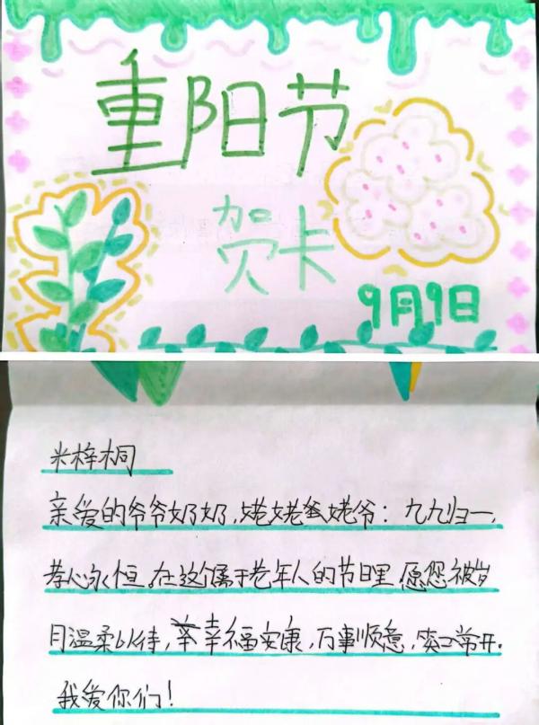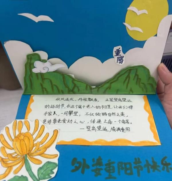 五六年级的同学们亲手制作重阳节贺卡,用绘画、剪贴、书法等方式装点,或一起动手制作糕点、美味饭菜,与长辈一起品尝。一笔一画勾勒对长辈的心意,一揉一捏包裹着温暖的关怀。欢声笑语里,长辈的笑容与节日的甜蜜一同绽放。