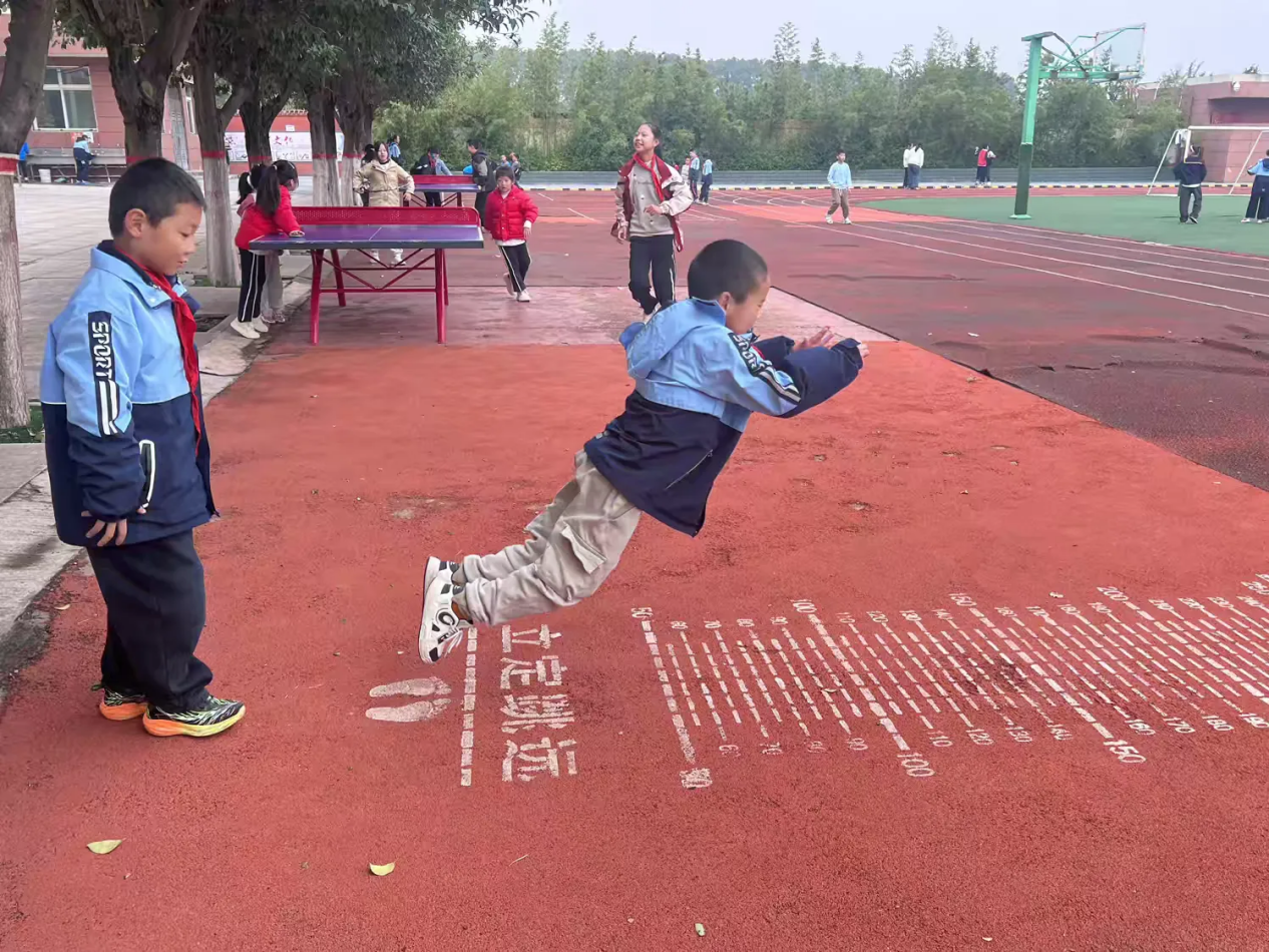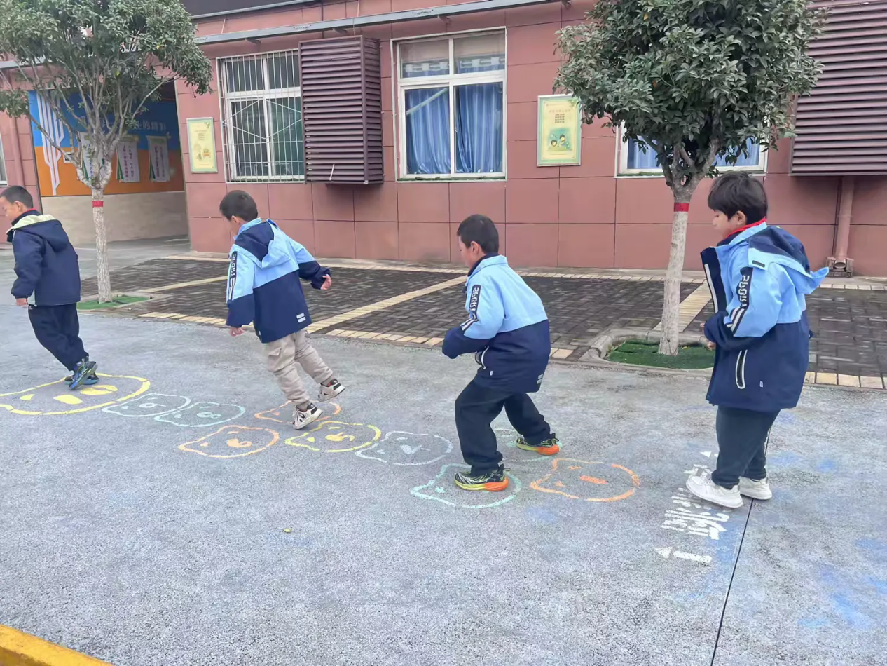 跳数字游戏能锻炼学生的平衡能力,还能帮助其熟悉数字顺序,是最受孩子们欢迎的游戏项目。一个个彩色格子像一只只快乐的小猫。孩子们排着队,单脚起跳、跨格前进,落地时小脸蛋涨得通红,却笑得像阳光下的花朵。“加油!别踩线!”旁边的同学喊着,稚嫩的声音汇成动人的乐章。