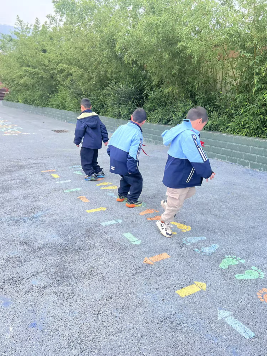 彩色的小脚丫标记在地面排成蜿蜒的队伍,孩子们踮着脚尖、弯着腰,小心翼翼地踩着“小脚印”前进,像一群小企鹅在散步,偶尔有人失去平衡摔倒,引来阵阵清脆的笑声。
