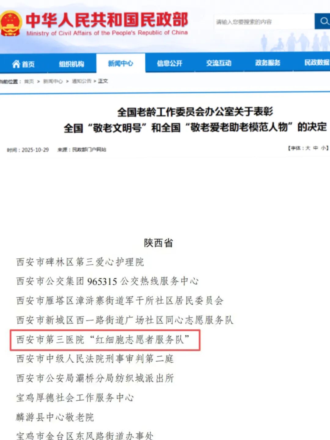 阳光讯(记者 郑亚雷 通讯员 党路加)近日,西安市第三医院“红细胞志愿者服务队”荣获全国“敬老文明号”荣誉称号,为三秦敬老事业再添光彩。