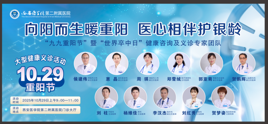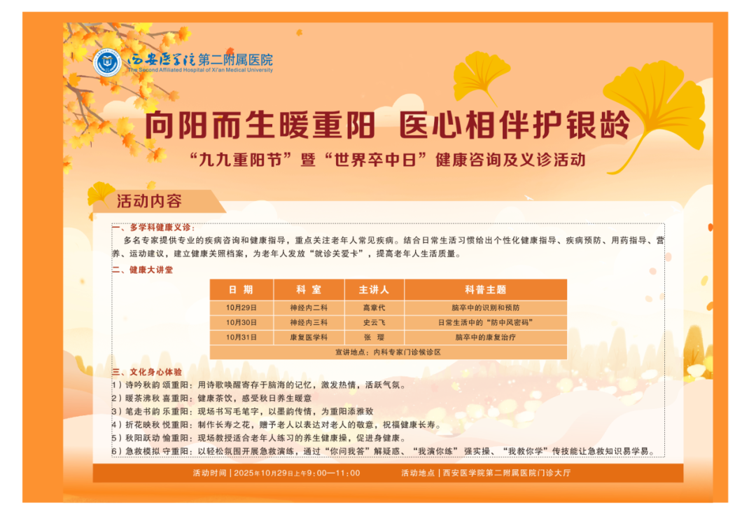 岁岁重阳,今又重阳。当“登高敬老”的传统佳节与“守护生命”的世界卒中日温暖邂逅,西安医学院第二附属医院多学科医疗团队怀揣对银龄群体的深切关怀,以传承民俗、守护健康为念,精心策划并开展了“向阳而生暖重阳 医心相伴护银龄”主题活动。活动将传统节日的脉脉关怀浸润在专业的医疗服务中,为老年朋友送上精准的健康评估与支持,更让尊老、敬老、爱老的美德在医者仁心中静静流淌。