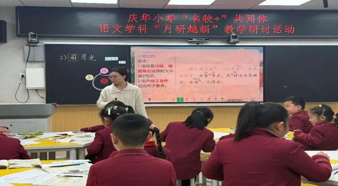 庆华小学王敏敏老师执教三年级《司马光》。王老师紧扣新课标对文言文启蒙教学的要求,以“讲故事”的形式开篇,拉近学生与古文的距离。课堂中,她创新采用“小组合作翻译小达人”活动,引导学生借助注释、联系上下文理解文言字词含义,在互助交流中梳理故事脉络;同时结合课文插图,鼓励学生想象司马光砸缸时的心理活动与动作细节,用自己的话复述故事,有效培养了学生的古文阅读理解能力与语言表达能力,体现了合作探究式创新教学的优势。