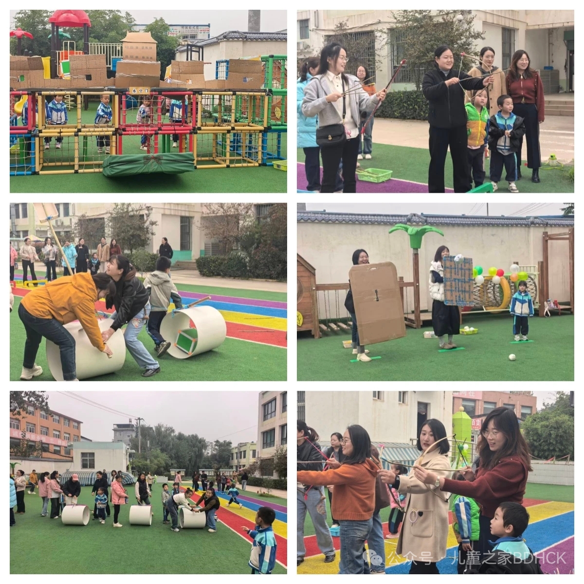 活动伊始,武器库对战环节率先拉开帷幕。前期,幼儿与教师共同收集材料、动手制作投石车、盾牌等 武器装备,并在活动当天化身小小解说员,向家长详细讲解各类武器的设计原理与使用方法。解说结束后,堡垒对战自主游戏正式开启,幼儿分组协作,利用自制武器展开趣味对抗,家长则在一旁观察鼓励,偶尔参与战术讨论。游戏过程中,孩子们不仅锻炼了动手能力与团队协作意识,更在沉浸式体验中激发了对传统军事文化的探索兴趣。活动后,教师组织亲子共同分享游戏心得,引导幼儿思考 如何通过合作赢得比赛,进一步深化了活动的教育意义。