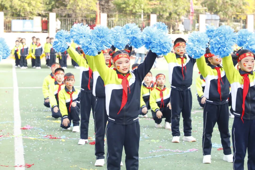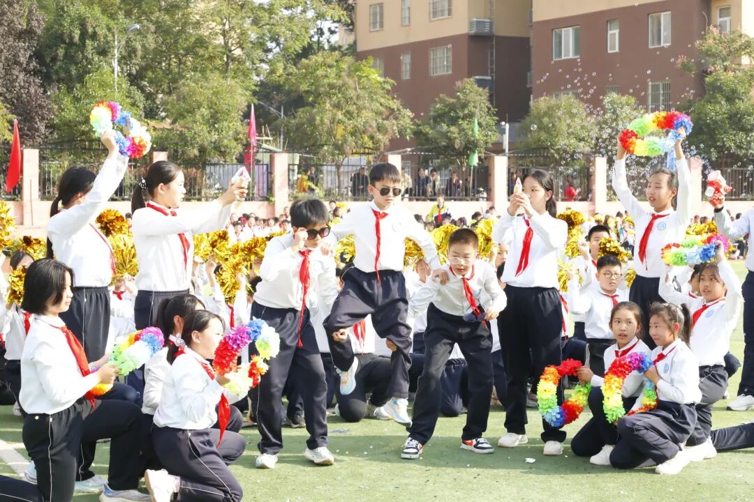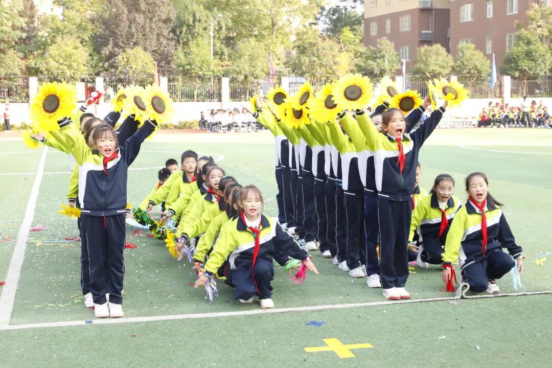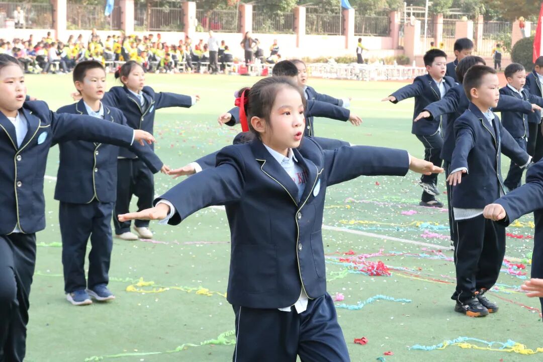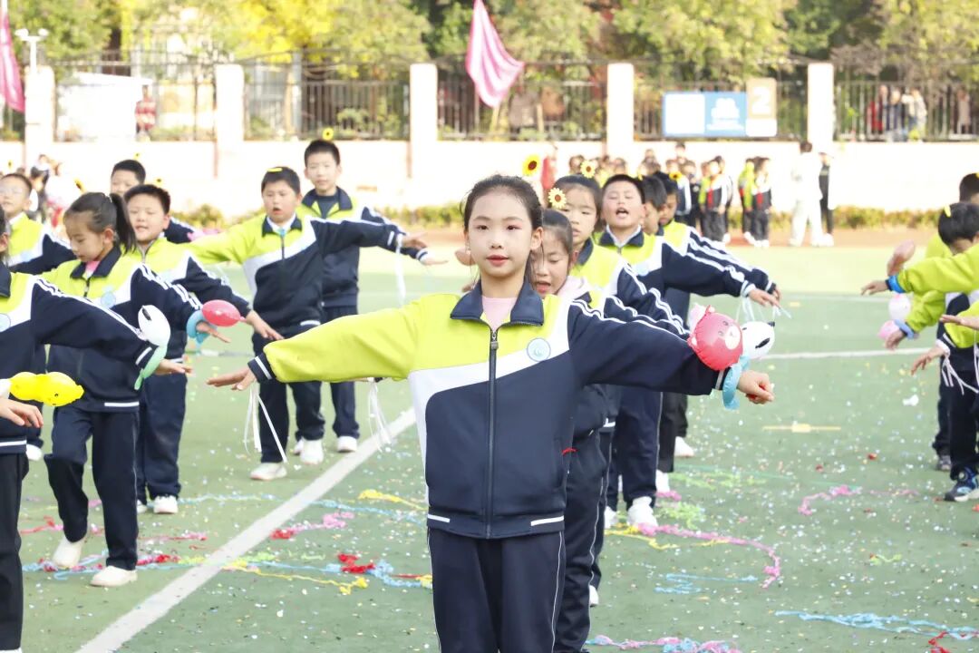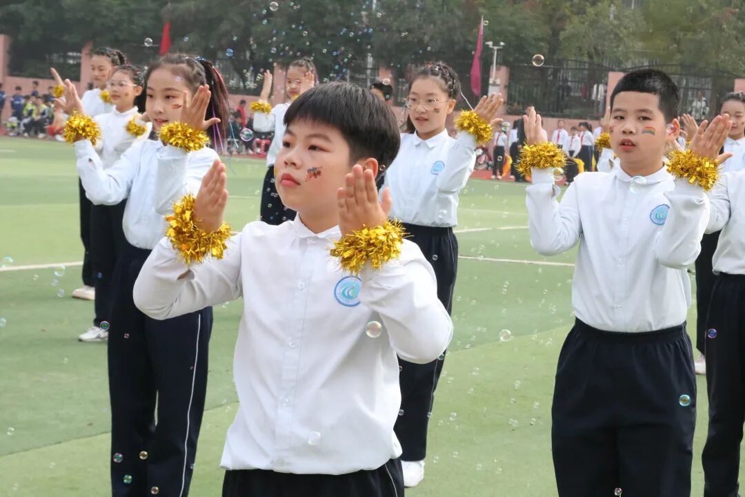 随着于晓龙副校长宣布体育艺术节开幕,全场掌声雷动,热血瞬间点燃。艺术展演环节,成为校园风采的生动缩影。二年级旗子舞《威武中华》,四十面旗帜翻飞,用舞姿诠释“威武不屈”的中华气魄;三年级《拥军秧歌》灵动欢快,舞步跳跃着民间欢乐,扭出少年的蓬勃朝气;四年级集体舞《逐梦娃・相亲相爱》温暖治愈,用协作诠释“集体逐梦”的力量;五年级《像你这样的朋友》活力满满,手臂相挽间藏着“并肩同行”的赛场默契;六年级方阵表演《象王行》气势磅礴,古韵与壮志交织,尽显少年担当。