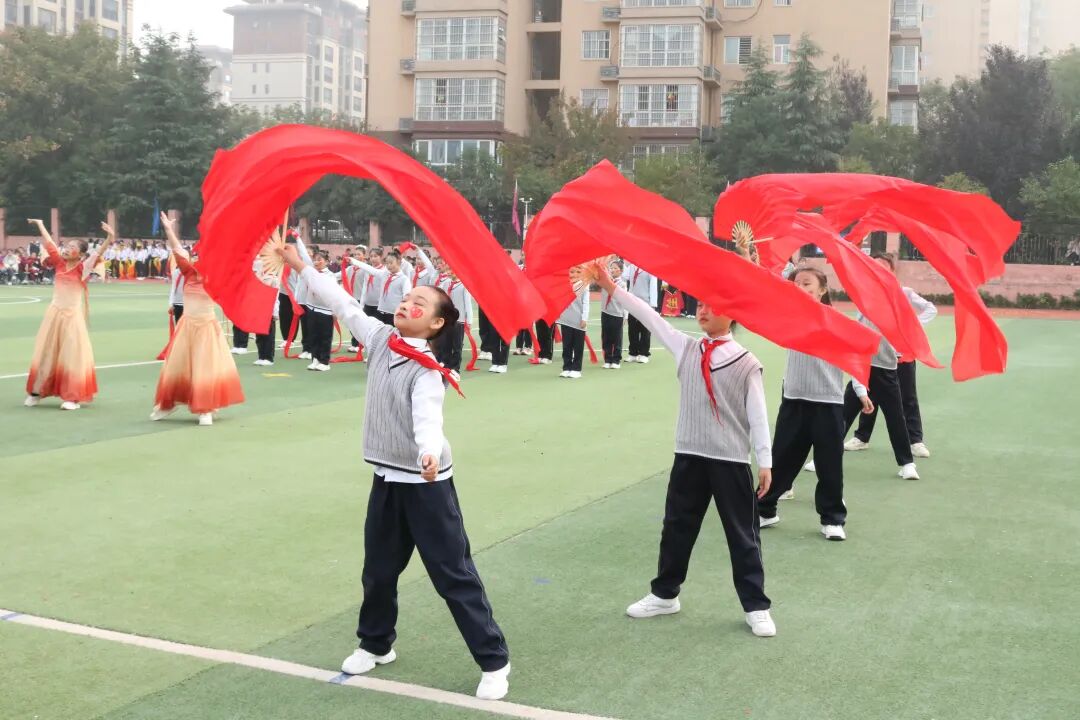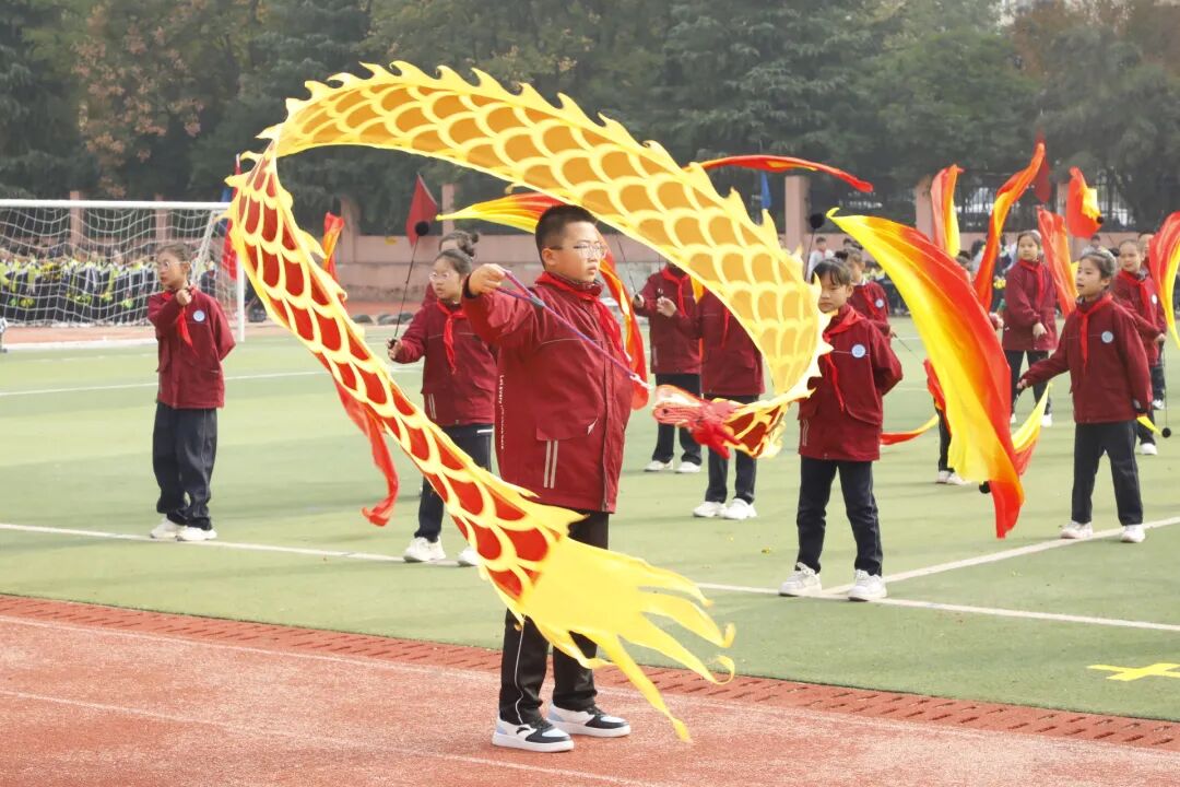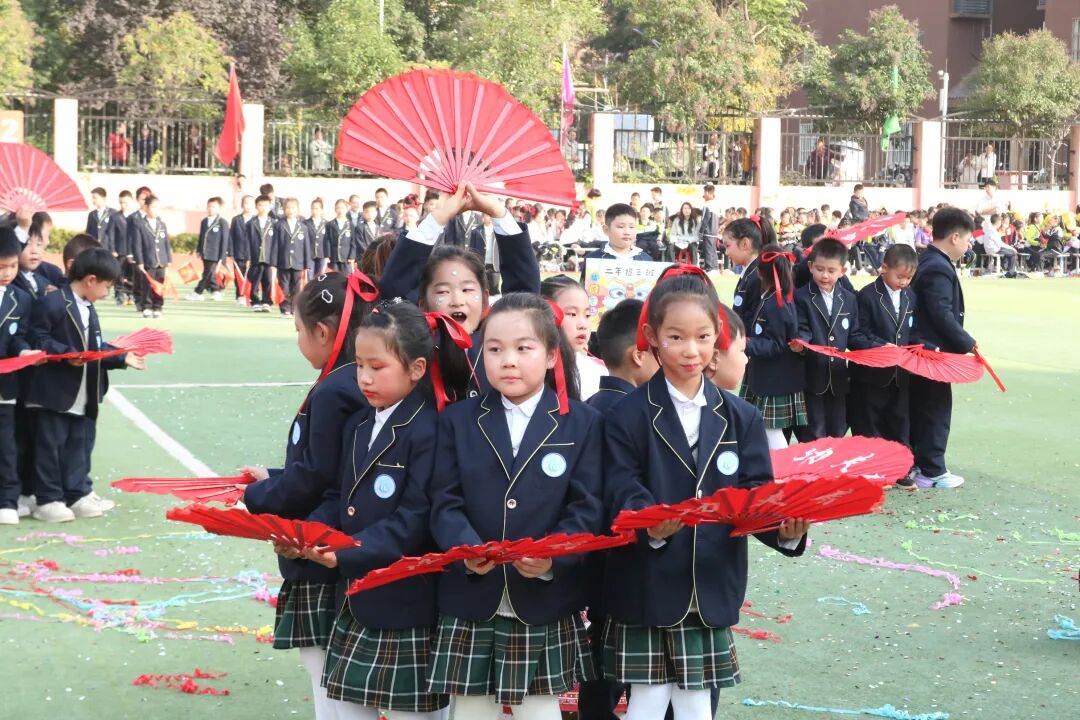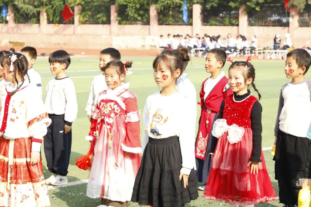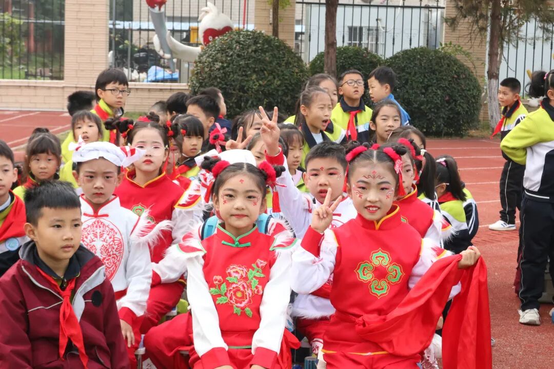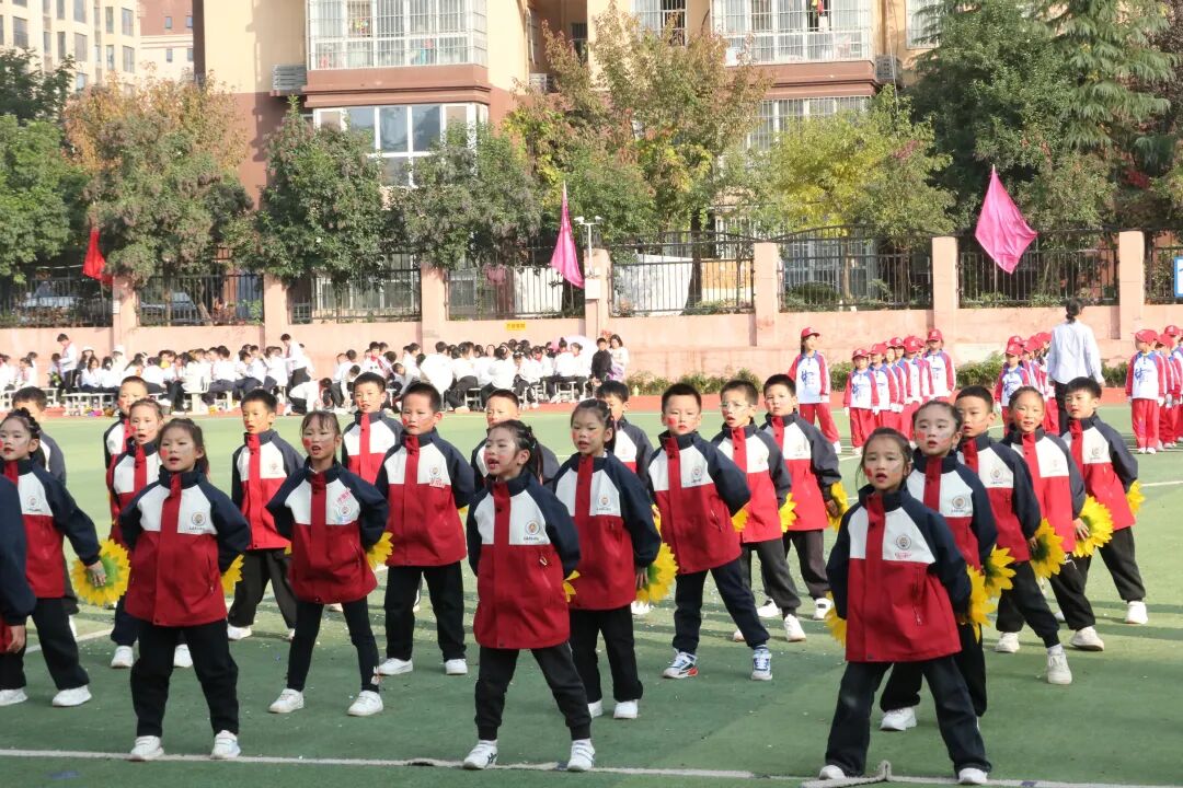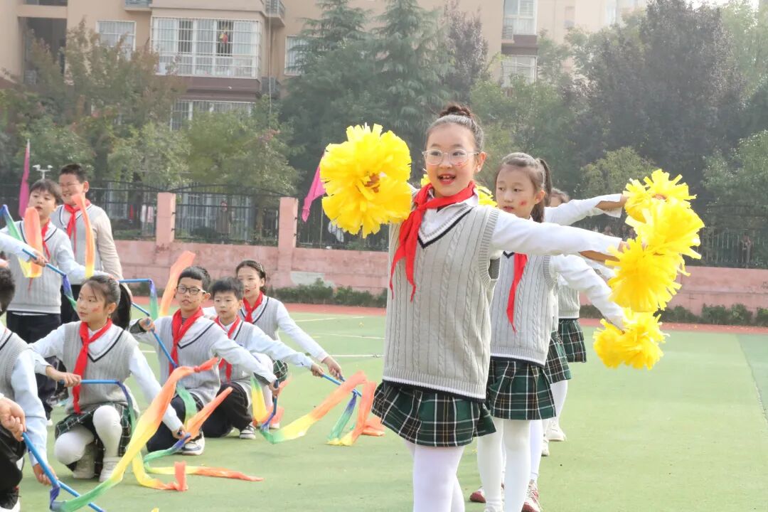 随着于晓龙副校长宣布体育艺术节开幕,全场掌声雷动,热血瞬间点燃。艺术展演环节,成为校园风采的生动缩影。二年级旗子舞《威武中华》,四十面旗帜翻飞,用舞姿诠释“威武不屈”的中华气魄;三年级《拥军秧歌》灵动欢快,舞步跳跃着民间欢乐,扭出少年的蓬勃朝气;四年级集体舞《逐梦娃・相亲相爱》温暖治愈,用协作诠释“集体逐梦”的力量;五年级《像你这样的朋友》活力满满,手臂相挽间藏着“并肩同行”的赛场默契;六年级方阵表演《象王行》气势磅礴,古韵与壮志交织,尽显少年担当。