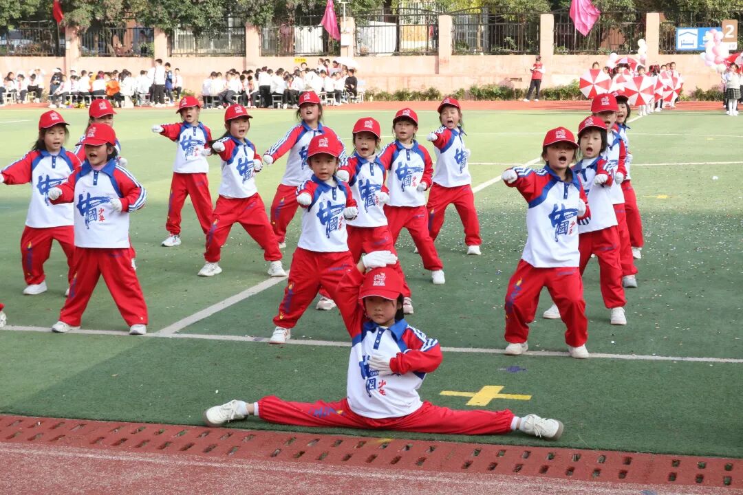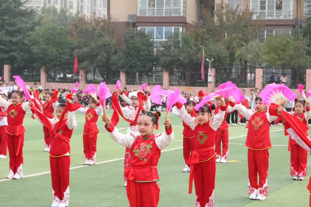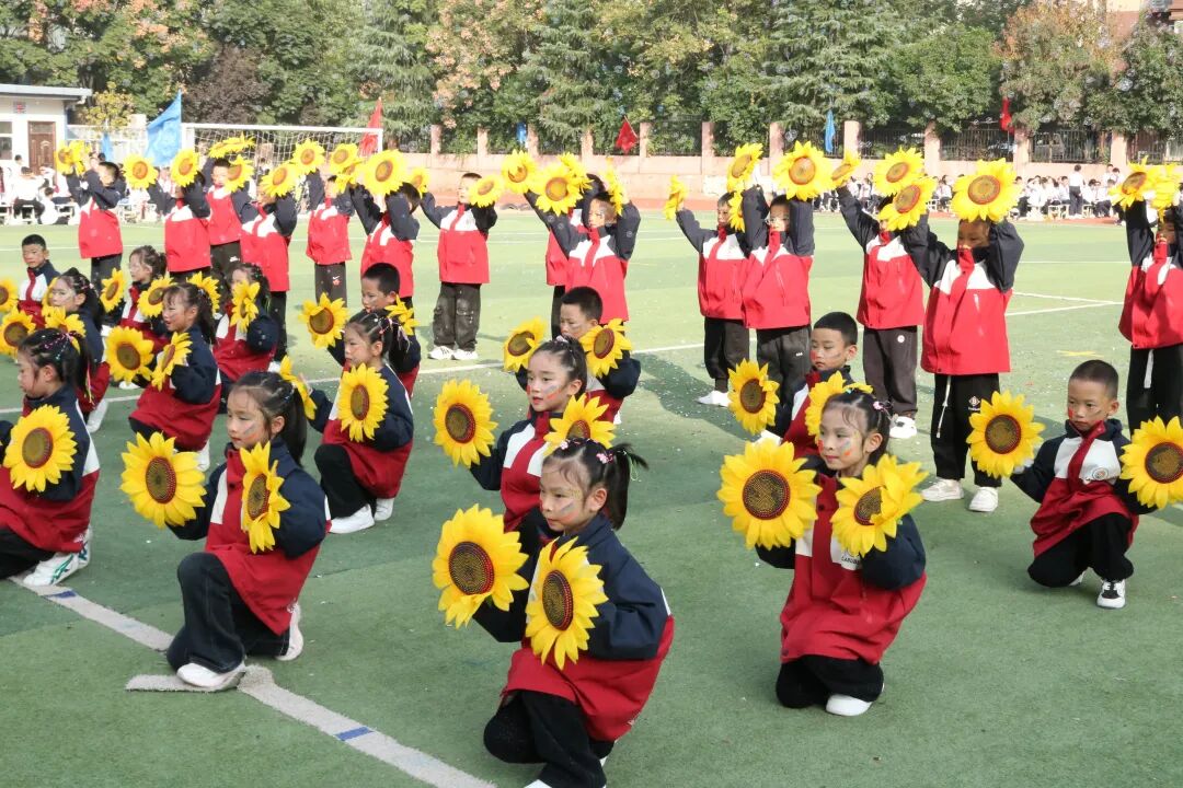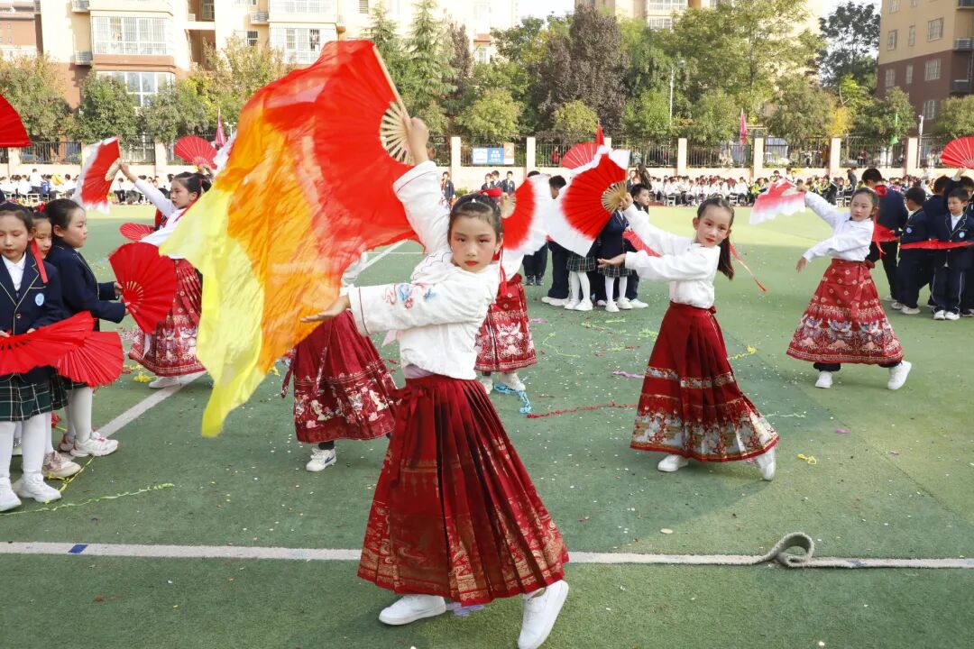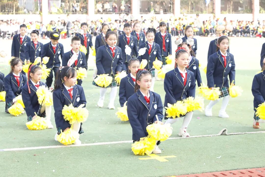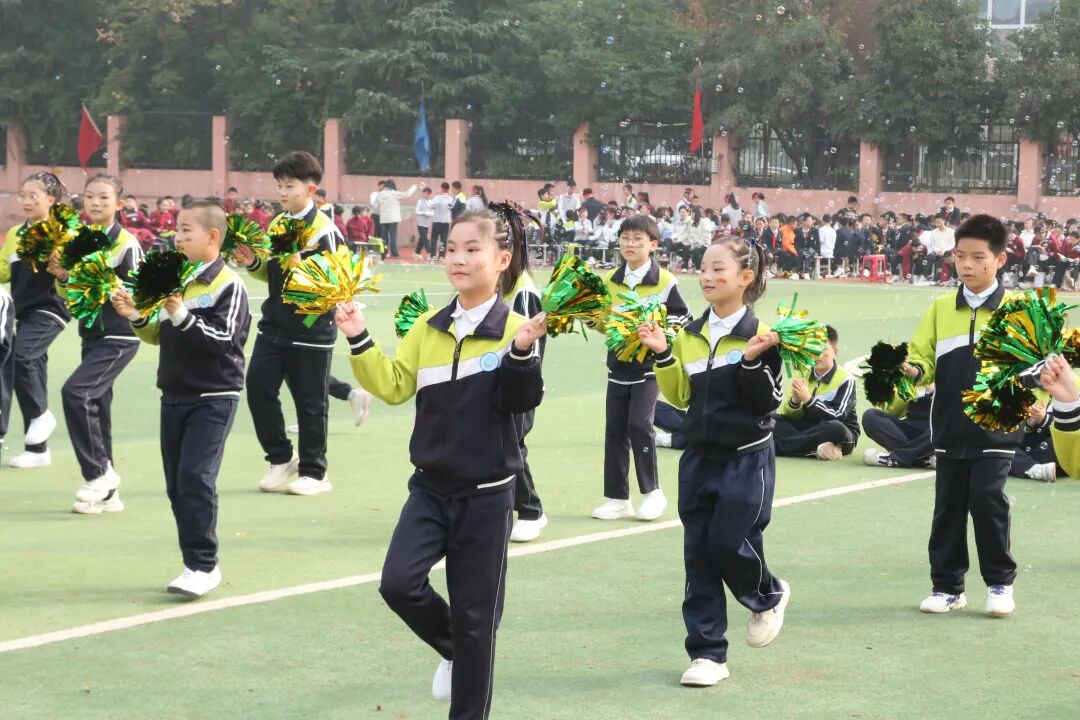 随着于晓龙副校长宣布体育艺术节开幕,全场掌声雷动,热血瞬间点燃。艺术展演环节,成为校园风采的生动缩影。二年级旗子舞《威武中华》,四十面旗帜翻飞,用舞姿诠释“威武不屈”的中华气魄;三年级《拥军秧歌》灵动欢快,舞步跳跃着民间欢乐,扭出少年的蓬勃朝气;四年级集体舞《逐梦娃・相亲相爱》温暖治愈,用协作诠释“集体逐梦”的力量;五年级《像你这样的朋友》活力满满,手臂相挽间藏着“并肩同行”的赛场默契;六年级方阵表演《象王行》气势磅礴,古韵与壮志交织,尽显少年担当。
