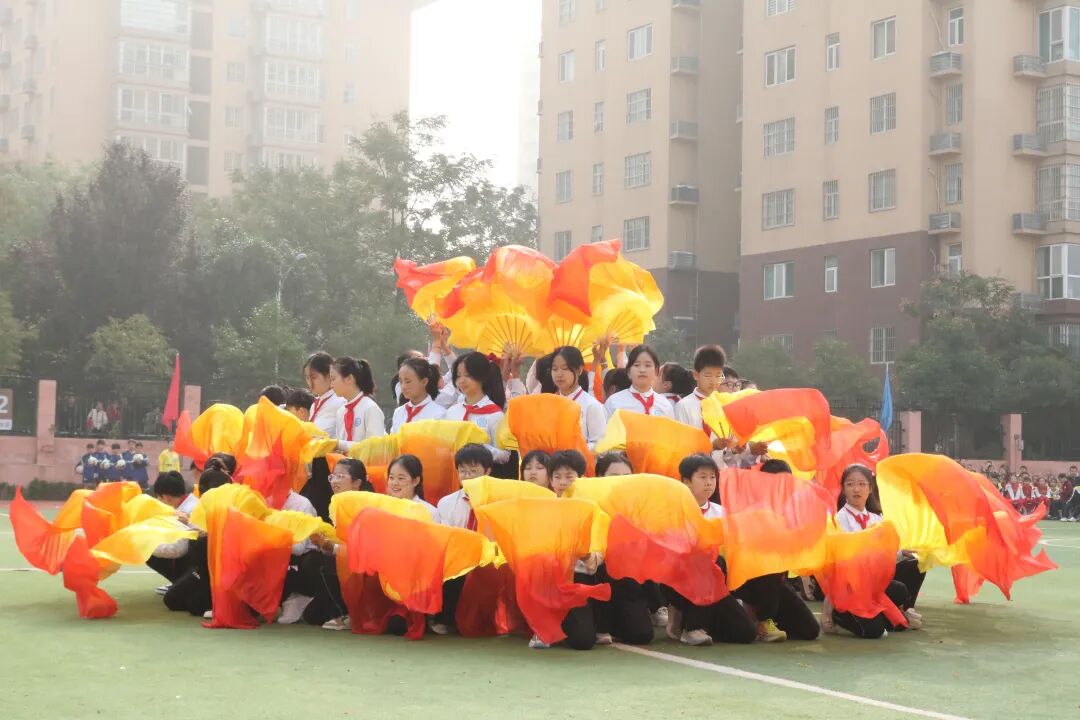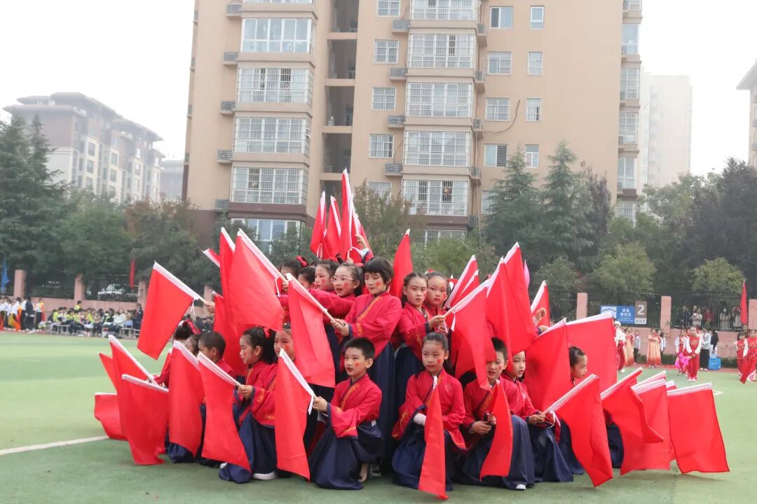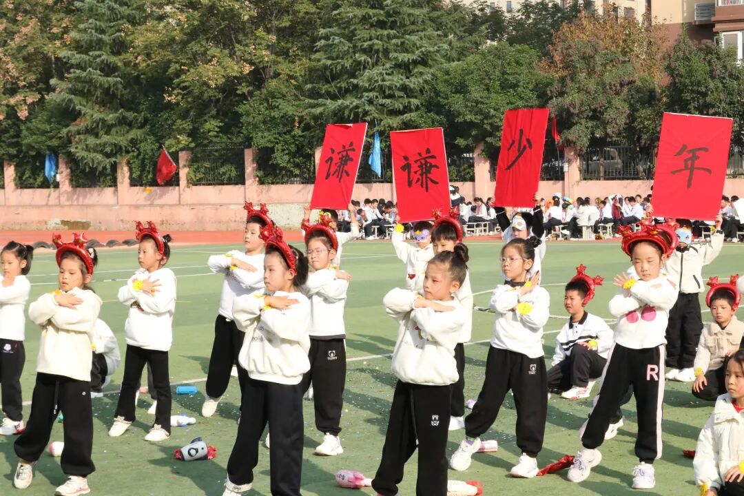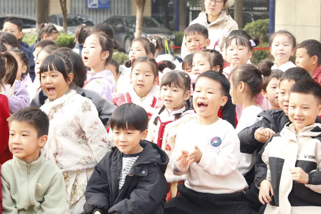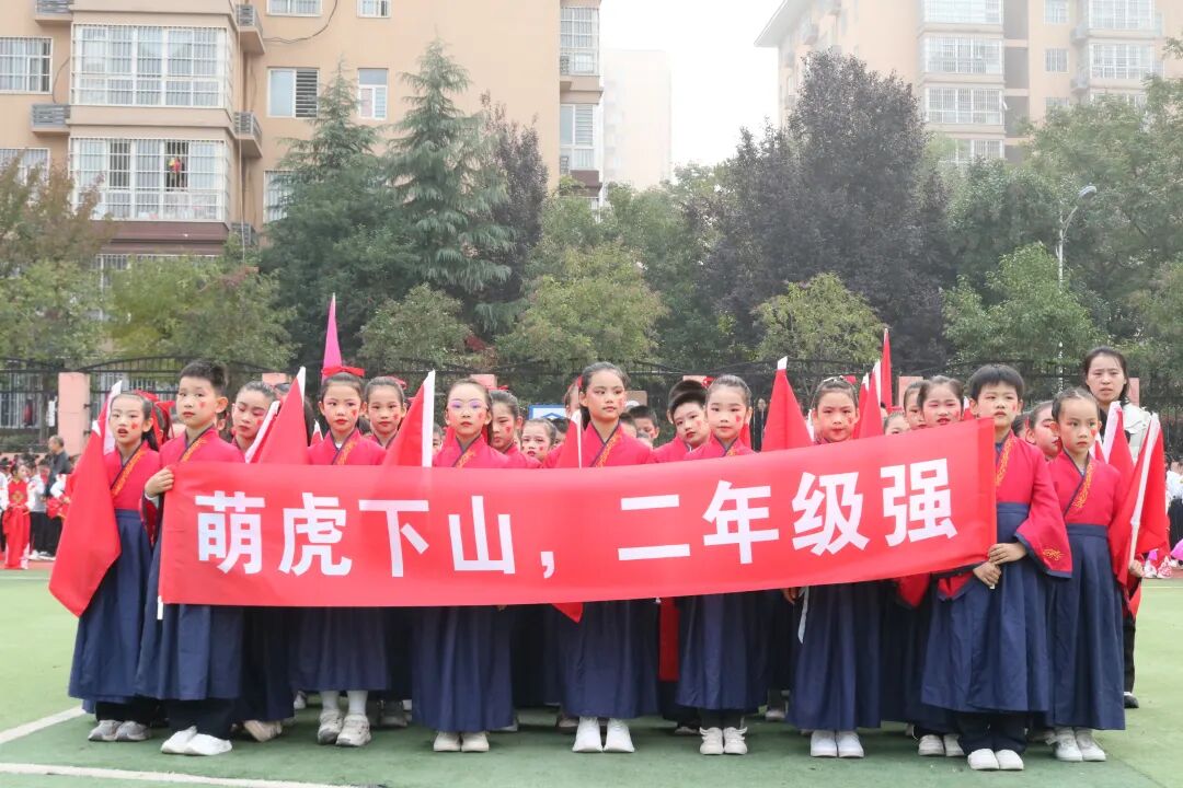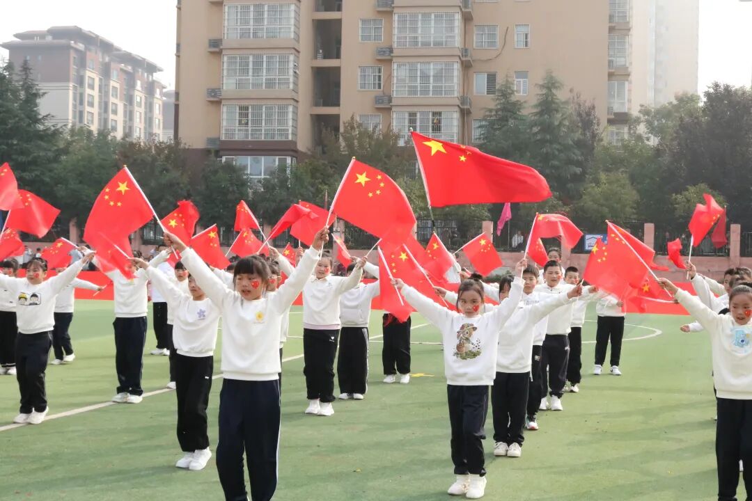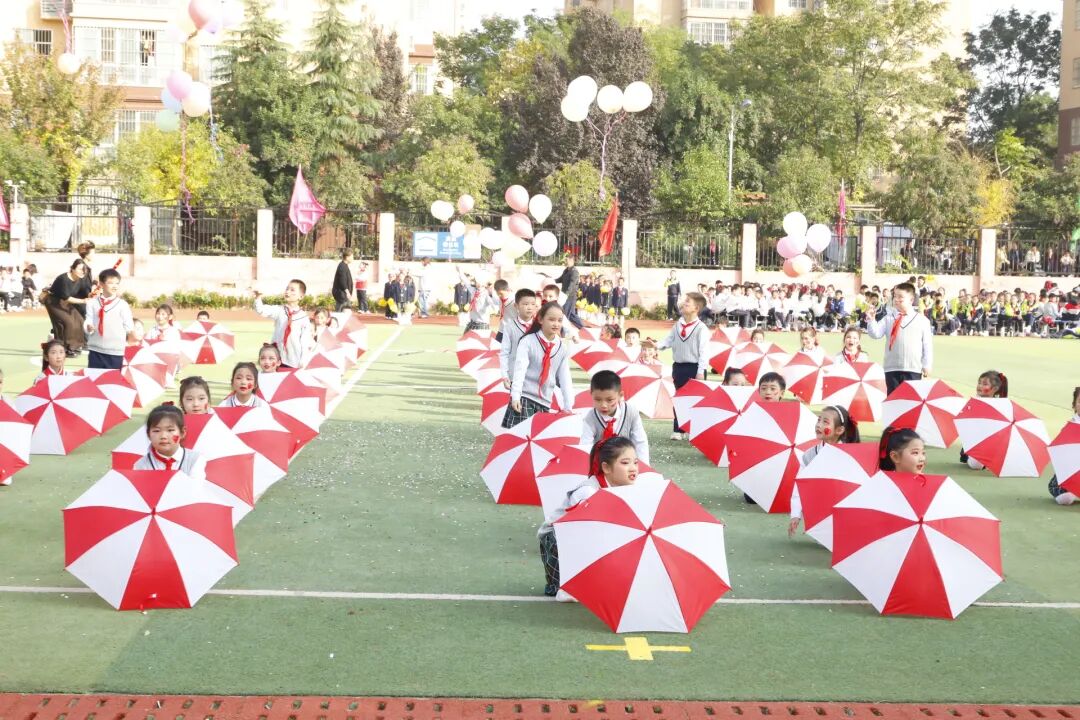 随着于晓龙副校长宣布体育艺术节开幕,全场掌声雷动,热血瞬间点燃。艺术展演环节,成为校园风采的生动缩影。二年级旗子舞《威武中华》,四十面旗帜翻飞,用舞姿诠释“威武不屈”的中华气魄;三年级《拥军秧歌》灵动欢快,舞步跳跃着民间欢乐,扭出少年的蓬勃朝气;四年级集体舞《逐梦娃・相亲相爱》温暖治愈,用协作诠释“集体逐梦”的力量;五年级《像你这样的朋友》活力满满,手臂相挽间藏着“并肩同行”的赛场默契;六年级方阵表演《象王行》气势磅礴,古韵与壮志交织,尽显少年担当。