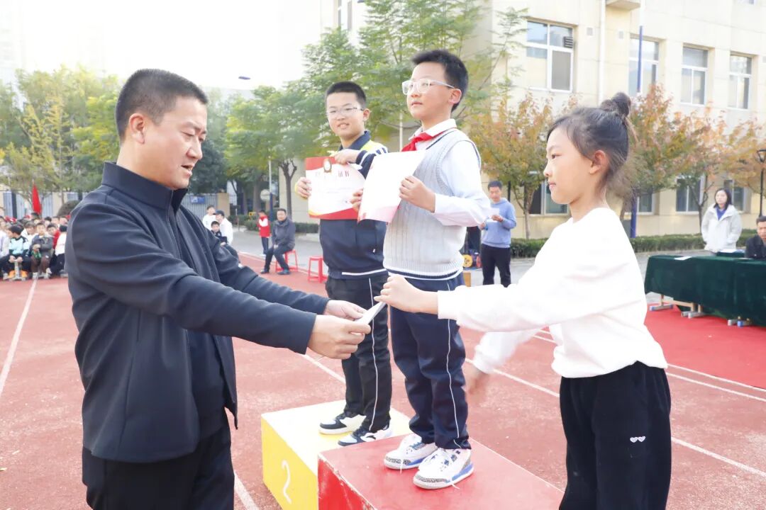经过激烈角逐与评委们的公正评判,各年级奖项尘埃落定。颁奖仪式上,校领导依次为获奖班级颁发奖状,鲜红的奖状在阳光下熠熠生辉,映照着同学们雀跃的脸庞,欢呼声响彻绿茵场,每一张笑脸都写满自豪,每一次掌声都承载着对努力的肯定。