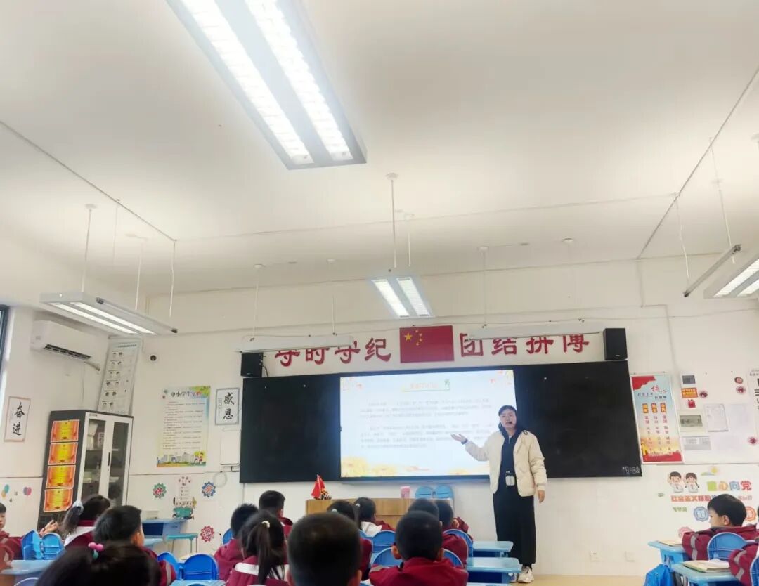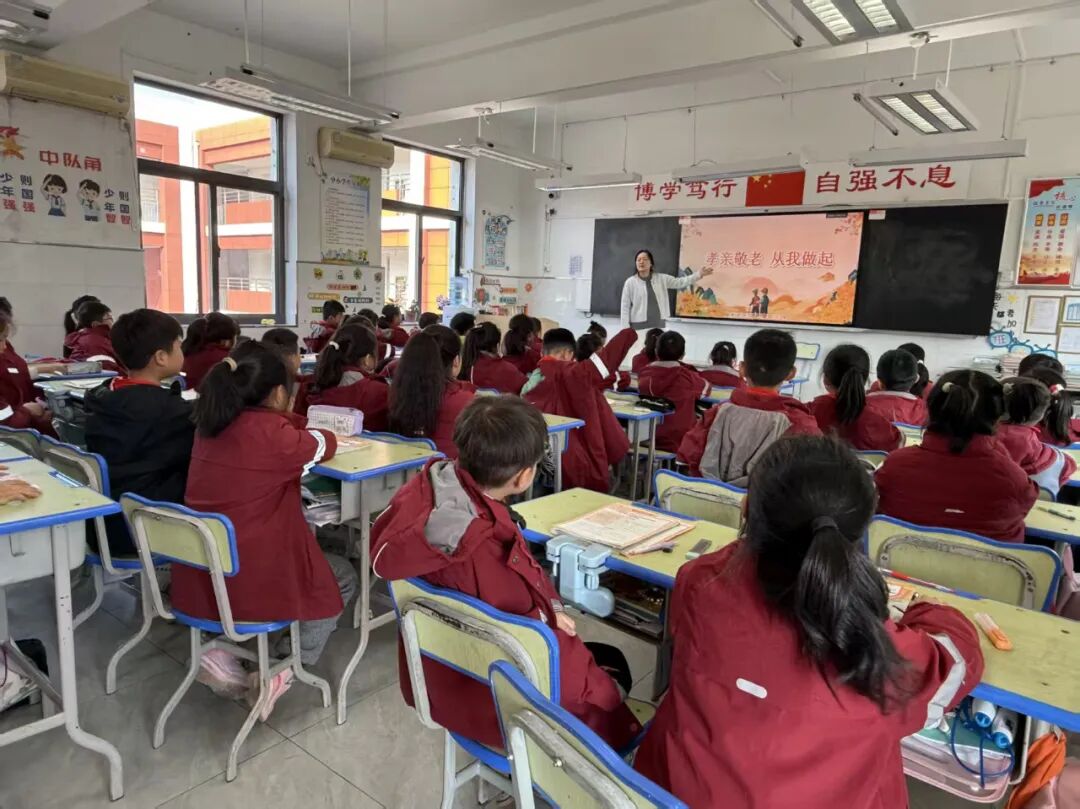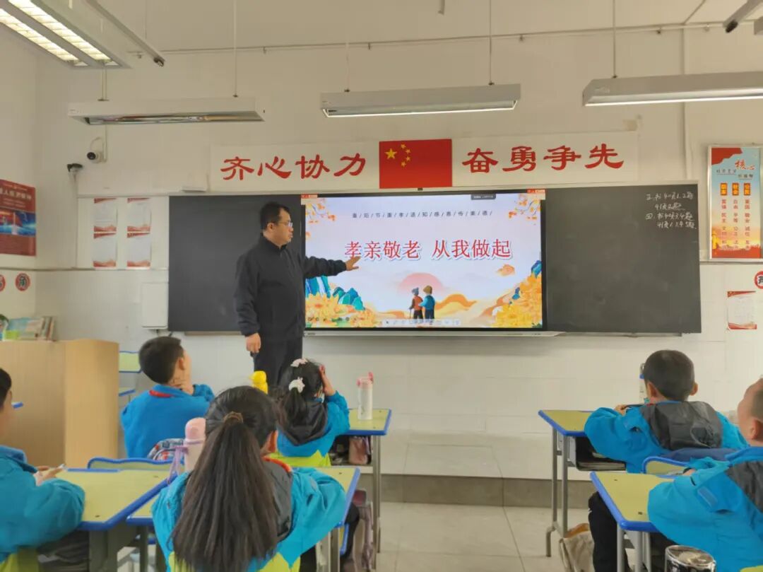 各班级开展“话说重阳”主题班会。课堂上,老师通过动画、故事讲解重阳节的起源——从古代“避灾祈福”的习俗,到如今“尊老敬老”的文化内核;结合“登高、赏菊、插茱萸、吃重阳糕”等传统习俗,引导学生分享家中长辈的温暖故事。让学生在交流中明白:孝心不是抽象的概念,而是藏在日常的点滴关怀里。
