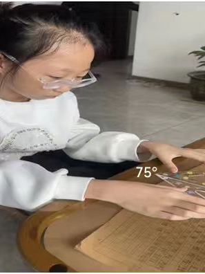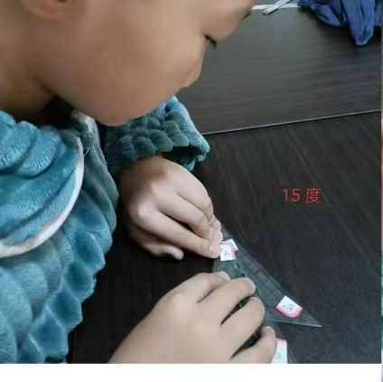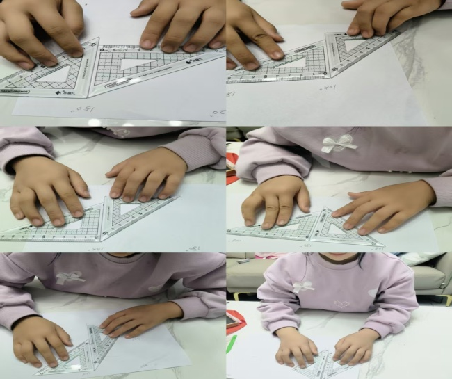 活动前,先明确一副三角尺的内角度数(30°、45°、60°、90°),随后通过拼合,叠切的方法,大家一边拼角,一边笔录,课堂外的实践场景俨然变成了生动的“数学实验室”。