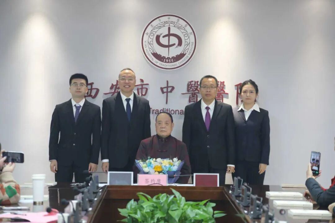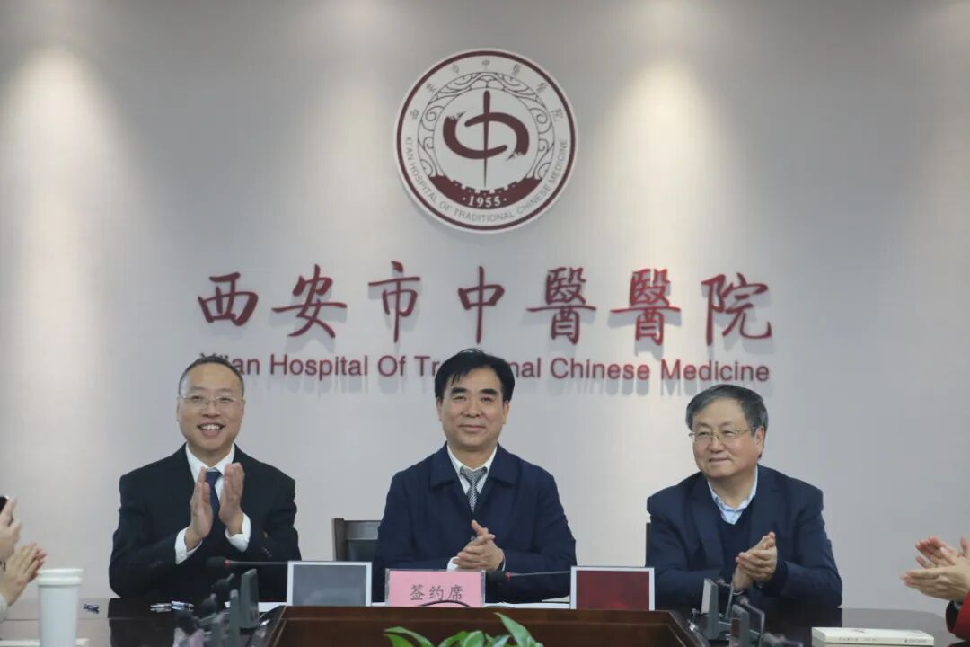 陕西中医药大学第二附属医院副院长黄峰、陕西中医药大学博士生导师王瑞辉、西安市中医医院针灸推拿康复科主任安军明签署工作站合作协议。