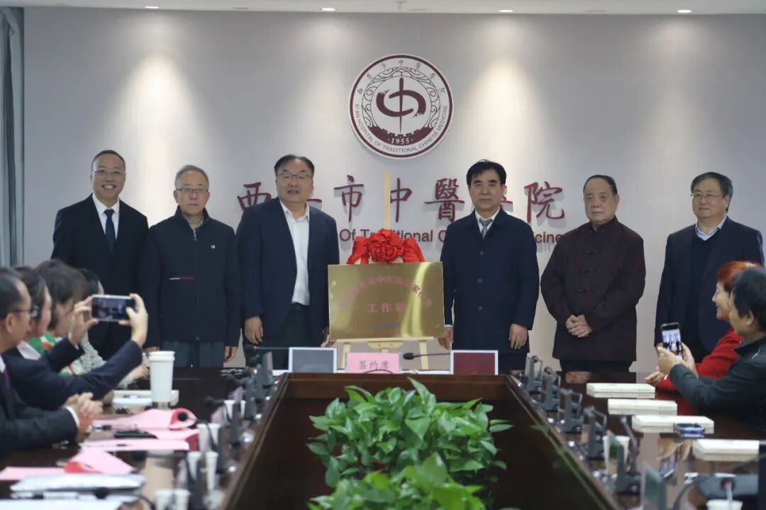 全国名老中医药专家殷克敬、陕西中医药大学博士生导师王瑞辉、陕西中医药大学第二附属医院副院长黄峰、西安市中医医院副院长肖兵、继承办主任张晓峰、针灸推拿康复科主任安军明共同为“殷克敬名老中医药专家传承工作站”揭牌。