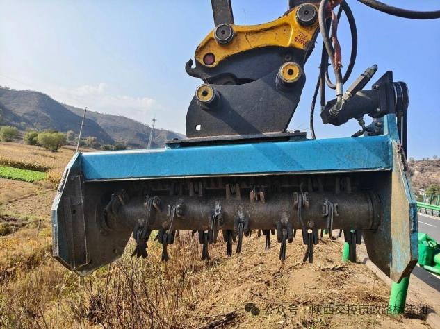 面对高速公路绿化养护面积大、效率低、安风险高的现实困境,榆林分公司创新引入“挖掘机改装碎草设备”,将普通挖掘机变身“除草神器”。该设备通过液压系统驱动高速旋转刀头,可对路基边坡、互通区绿化带等区域杂草实现快速粉碎处理,操作人员只需在驾驶室作业,即可高效完成大片区域清理,大幅降低人工作业强度和交通安全风险。