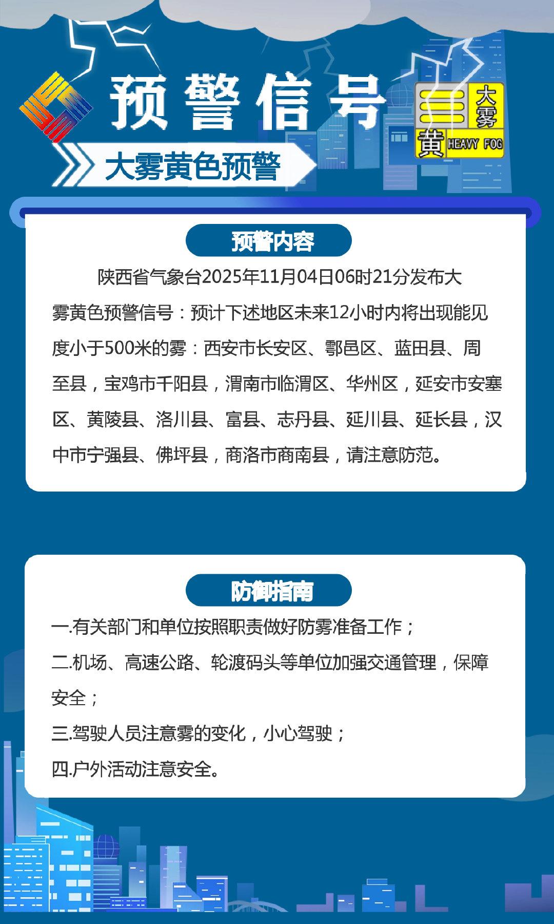 陕西省气象台2025年11月4日6时21分发布大雾黄色预警信号:预计下述地区未来12小时内将出现能见度小于500米的雾:西安市长安区、鄠邑区、蓝田县、周至县,宝鸡市千阳县,渭南市临渭区、华州区,延安市安塞区、黄陵县、洛川县、富县、志丹县、延川县、延长县,汉中市宁强县、佛坪县,商洛市商南县,请注意防范。