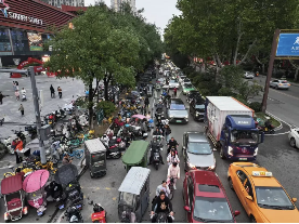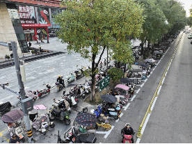 二、大兴东路龙湖商圈南辅道改造前:非机动车停放秩序混乱,影响车辆正常通行,晚高峰机动车平均车速仅8km/h