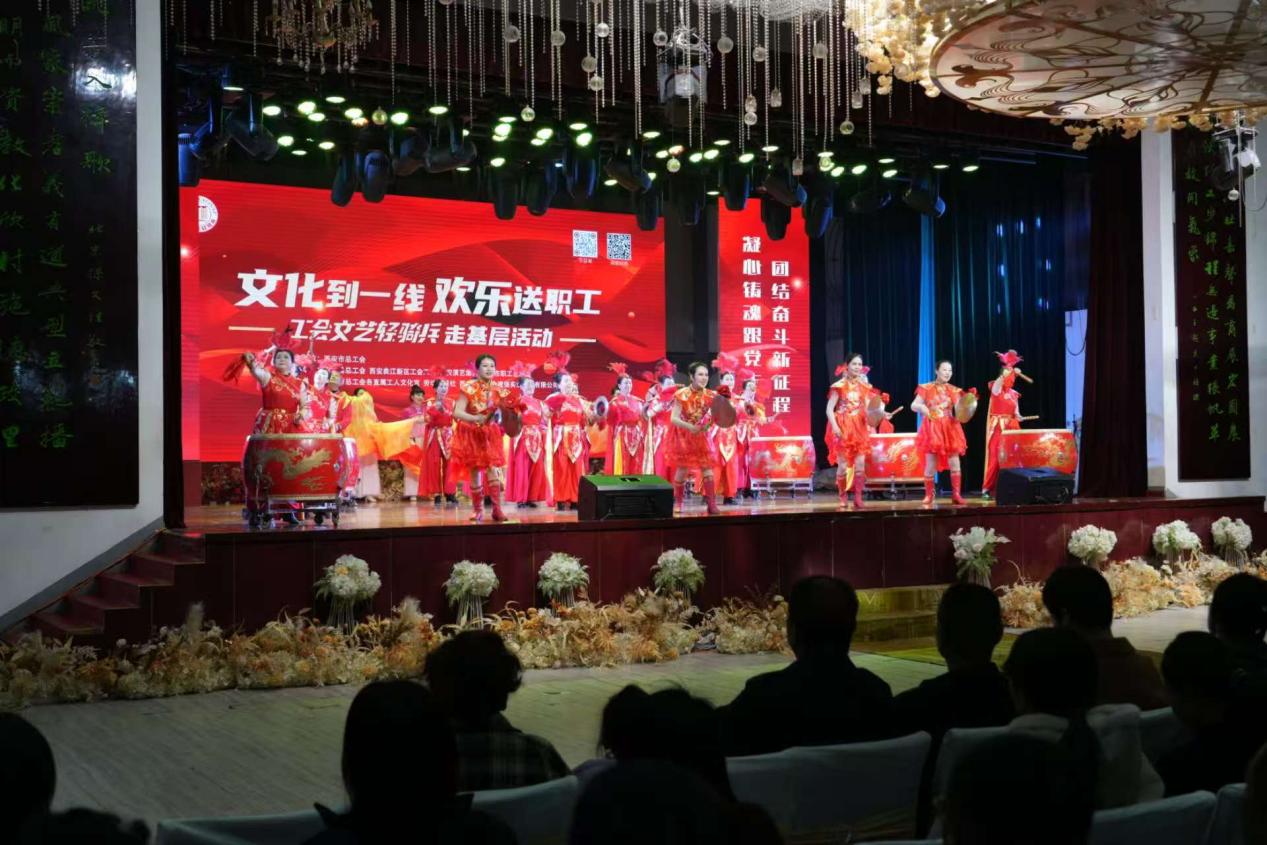 现场,来自周至各镇街的基层工会工作人员和新就业形态劳动者300余人观看了演出。由周至县总工会带来的开场舞《鼓舞》营造出锣鼓喧天的喜庆气氛,瞬间点燃了全场。随后,来自西安市职工艺术团和西安演艺集团的青年演员们用自己精湛的表演,让现场陷入一片欢乐的海洋。