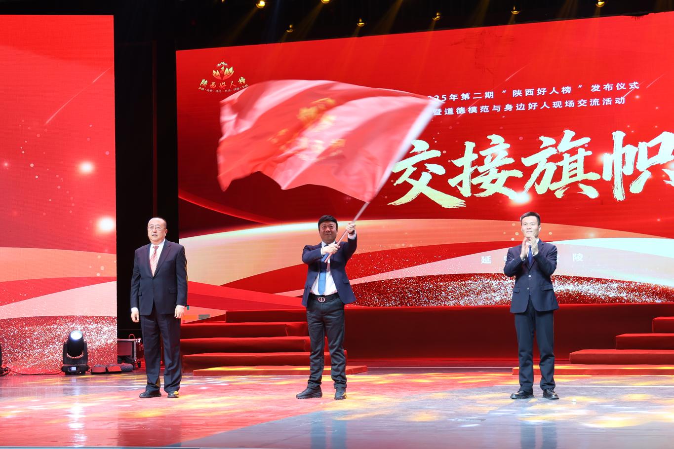 现场的道德模范、身边好人代表向社会各界联合发出倡议,号召大家争做崇高道德的践行者、文明风尚的引领者、幸福生活的创造者。活动最后,中共陕西省委精神文明建设办公室、延安市黄陵县、宝鸡市陈仓区共同完成旗帜交接仪式,标志着下一期“陕西好人榜”发布仪式将在宝鸡市陈仓区举行。