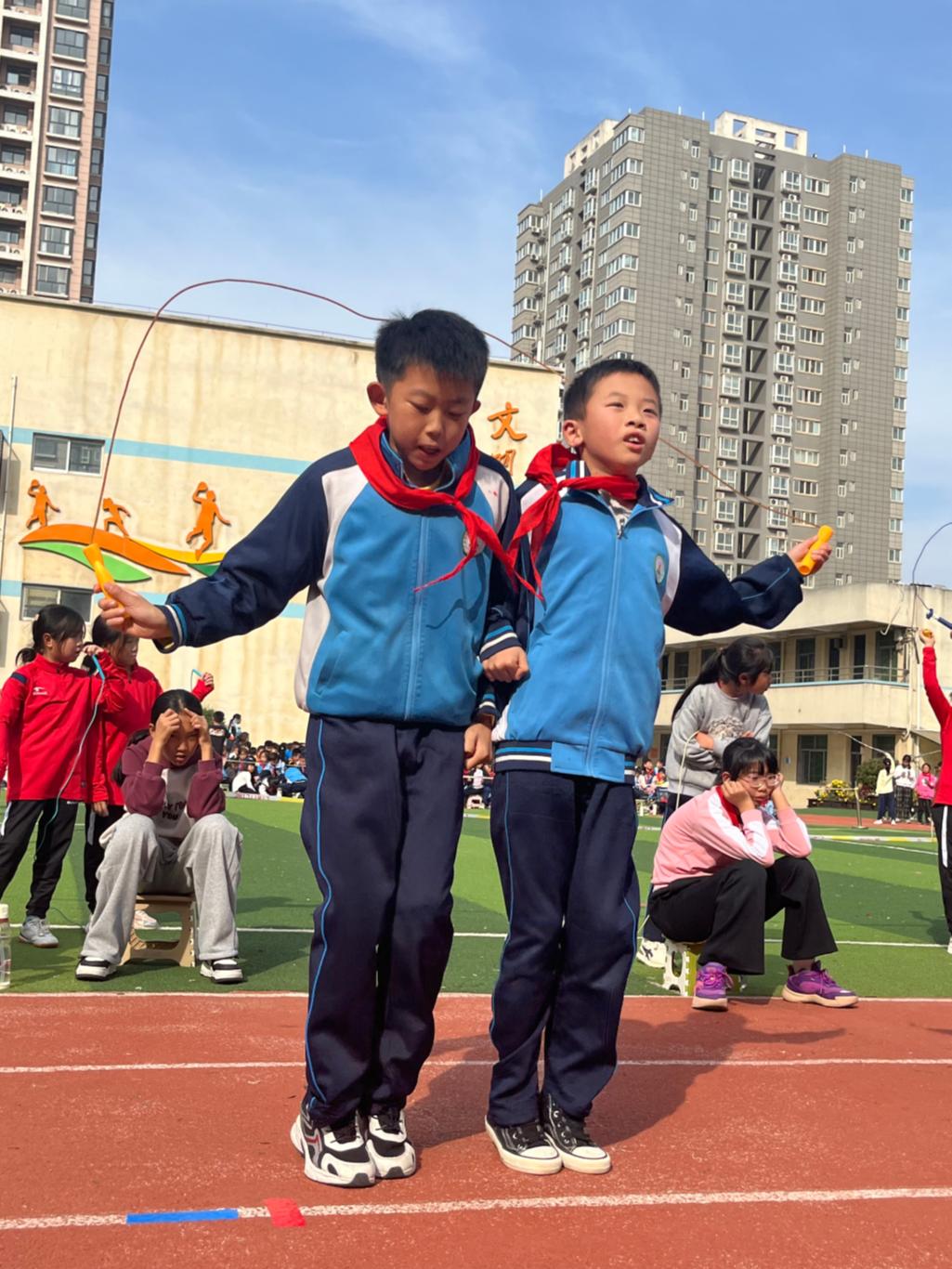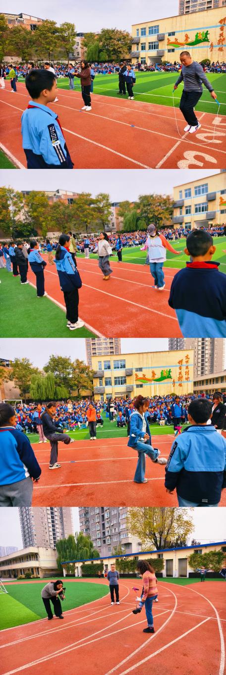 该校皮筋舞社团、三跳社团的同学们也带来了精彩绝伦的表演。皮筋舞社团的队员们踩着明快的节奏,彩色皮筋在脚下翻飞成灵动弧线,每一个跳跃都满是童真活力。三跳社团的同学们更是亮眼,毽子在脚尖轻巧起落,小绳如银蛇穿梭,大绳甩动掀起阵阵欢呼。精彩的节目一个接一个,瞬间点燃了现场的气氛,欢呼声、掌声此起彼伏,校园变成了一片欢乐的海洋。